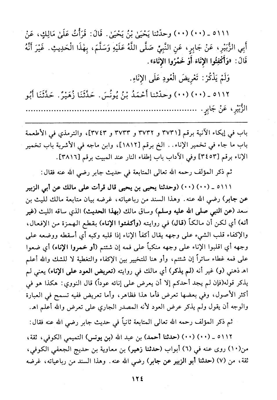 ٥١١١ - (٠٠) (٠٠) وحدَّثنا يَحْيَى بْنُ يَحْيَى. قَال: قَرَأْتُ عَلَى مَالِكٍ، عَنْ أَبِي الزُّبَيرِ، عَنْ جَابِرٍ، عَنِ النَّبِيِّ صَلَّى اللهُ عَلَيهِ وَسَلَّمَ، بِهذَا الْحَدِيثِ. غَيرَ أَنَّهُ قَال: "وَأَكفِئُوا الإِنَاءَ أَوْ خَمِّرُوا الإِنَاءَ".