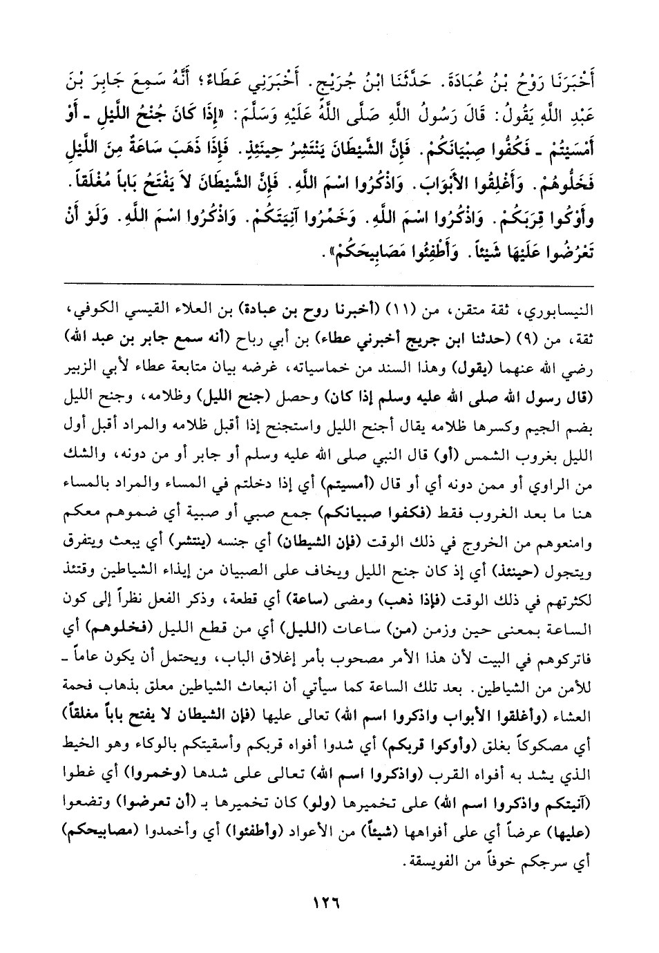 أَخْبَرَنَا رَوْحُ بْنُ عُبَادَةَ. حَدَّثَنَا ابْنُ جُرَيجٍ. أَخْبَرَنِي عَطَاءٌ؛ أَنَّهُ سَمِعَ جَابِرَ بْنَ عَبْدِ اللهِ يَقُولُ: قَال رَسُولُ اللهِ صَلَّى اللهُ عَلَيهِ وَسَلَّمَ: "إِذَا كَانَ جُنْحُ اللَّيلِ - أَوْ أَمْسَيتُمْ - فَكُفُّوا صِبْيَانَكُمْ. فَإِنَّ الشَّيطَانَ يَنْتَشِرُ حِينَئِذٍ. فَإِذَا ذَهَبَ سَاعَةٌ مِنَ اللَّيلِ فَخَلُّوهُمْ. وَأَغْلِقُوا الأَبْوَابَ. وَاذْكُرُوا اسمَ اللهِ. فَإِنَّ الشَّيطَانَ لَا يَفْتَحُ بَابا مُغْلَقًا. وأَوْكُوا قِرَبَكُمْ. وَاذْكُرُوا اسْمَ اللهِ. وَخَمِّرُوا آنِيَتَكُمْ. وَاذْكُرُوا اسْمَ اللهِ. وَلَوْ أَنْ تَعْرُضُوا عَلَيهَا شَيئًا. وَأَطْفِئُوا مَصَابِيحَكُمْ"