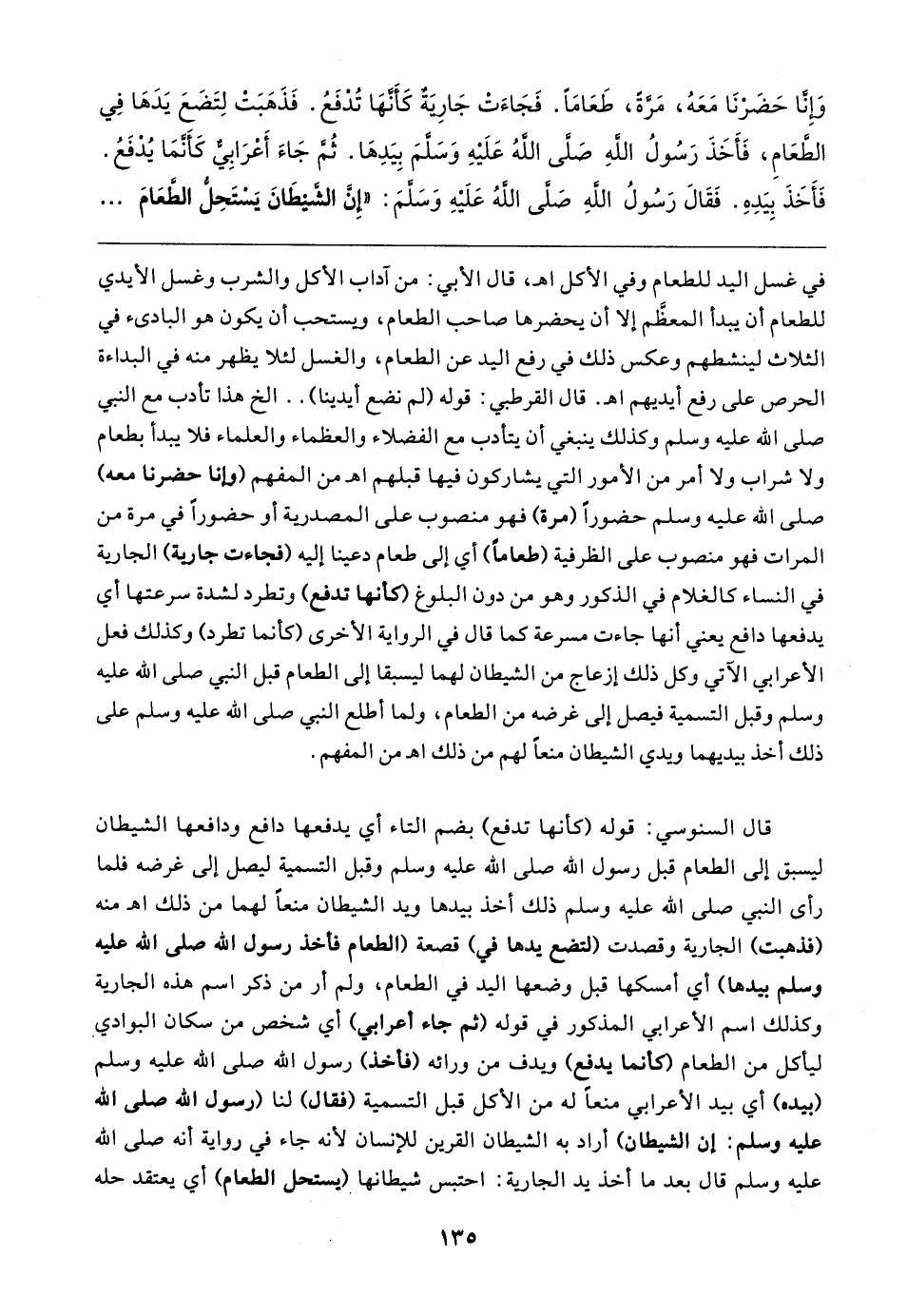 وَإِنَّا حَضَرْنَا مَعَهُ، مَرَّةً، طَعَامًا. فَجَاءَتْ جَارَيةٌ كَأَنَّهَا تُدْفَعُ. فَذَهَبَتْ لِتَضَعَ يَدَهَا فِي الطَّعَامِ، فَأَخَذَ رَسُولُ اللهِ صَلَّى اللهُ عَلَيهِ وَسَلَّمَ بِيَدِهَا. ثُمَّ جَاءَ أَعْرَابِيُّ كَأَنَّمَا يُدْفَعُ. فَأَخَذَ بِيَدِهِ، فَقَال رَسُولُ اللهِ صَلَّى اللهُ عَلَيهِ وَسَلَّمَ: "إِنَّ الشَّيطَانَ يَسْتَحِلُّ الطَّعَامَ