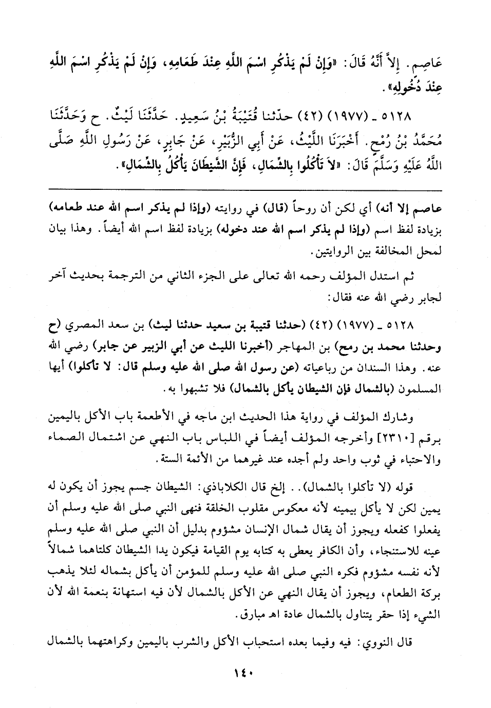 ٥١٢٨ - (١٩٧٧) (٤٢) حدَّثنا قُتَيبَةُ بْنُ سَعِيدٍ. حَدَّثَنَا لَيثٌ. ح وَحَدَّثَنَا مُحَمَّدُ بْنُ رُمْحٍ. أَخْبَرَنَا اللَّيثُ، عَنْ أَبِي الزُّبَيرِ، عَنْ جَابِرٍ، عَنْ رَسُولِ اللهِ صَلَّى اللهُ عَلَيهِ وَسَلَّمَ قَال: "لَا تَأْكُلُوا بِالشِّمَالِ، فَإِنَّ الشَّيطَانَ يَأْكُلُ بِالشِّمَالِ"