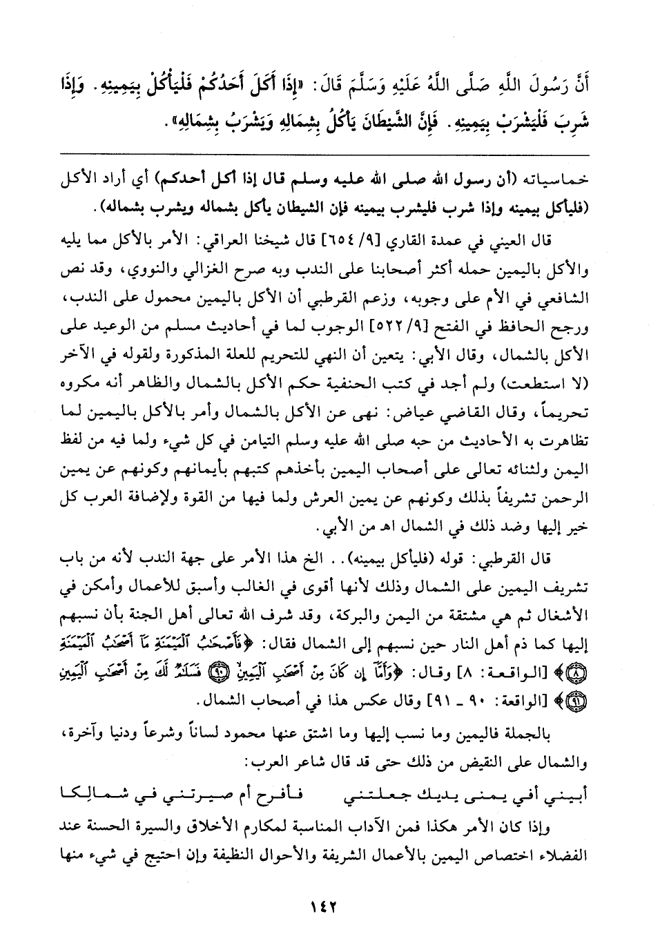 أَنَّ رَسُولَ اللهِ صَلَّى اللهُ عَلَيهِ وَسَلَّمَ قَال: "إِذَا أَكَلَ أَحَدُكُمْ فَلْيَأْكُلْ بِيَمِينِهِ. وَإِذَا شَرِبَ فَلْيَشْرَبْ بِيَمِينِهِ. فَإِنَّ الشَّيطَانَ يَأكُلُ بِشِمَالِهِ وَيَشْرَبُ بِشِمَالِهِ"