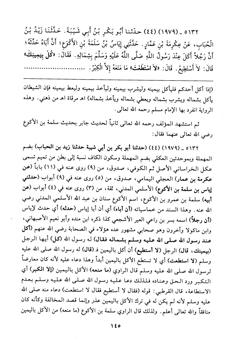 ٥١٣٢ - (١٩٧٩) (٤٤) حدَّثنا أَبُو بَكْرِ بْنُ أَبِي شَيبَةَ. حَدَّثَنَا زيدُ بْنُ الْحُبَابِ، عَنْ عِكْرِمَةَ بْنِ عَمَّارٍ. حَدَّثَنِي إِيَاسُ بْنُ سَلَمَةَ بْنِ الأَكْوَعِ؛ أَنَّ أَبَاهُ حَدَّثَهُ؛ أَنَّ رَجُلا أَكَلَ عِنْدَ رَسُولُ اللهِ صَلَّى اللهُ عَلَيهِ وَسَلَّمَ بِشِمَالِهِ. فَقَال: "كُلْ بِيَمِينِكَ" قَال: لَا أَسْتَطِيعُ. قَال: "لَا اسْتَطَعْتَ" مَا مَنَعَهُ إِلَّا الْكِبْرُ