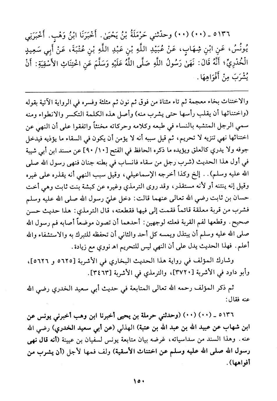 ٥١٣٦ - (٠٠) (٠٠) وحدّثني حَرْمَلَةُ بْنُ يَحْيَى. أَخْبَرَنَا ابْنُ وَهْبٍ. أَخْبَرَنِي يُونُسُ، عَنِ ابْنِ شِهَابٍ، عَنْ عُبَيدِ اللهِ بْنِ عَبْدِ اللهِ بْنِ عُتْبَةَ، عَنْ أَبِي سَعِيدٍ الْخُدْرِيِّ؛ أَنَّهُ قَال: نَهَى رَسُولُ اللهِ صَلَّى اللهُ عَلَيهِ وَسَلَّمَ عَنِ اخْتِنَاثِ الأَسْقِيَةِ: أَنْ يُشْرَبَ مِنْ أَفْوَاهِهَا
