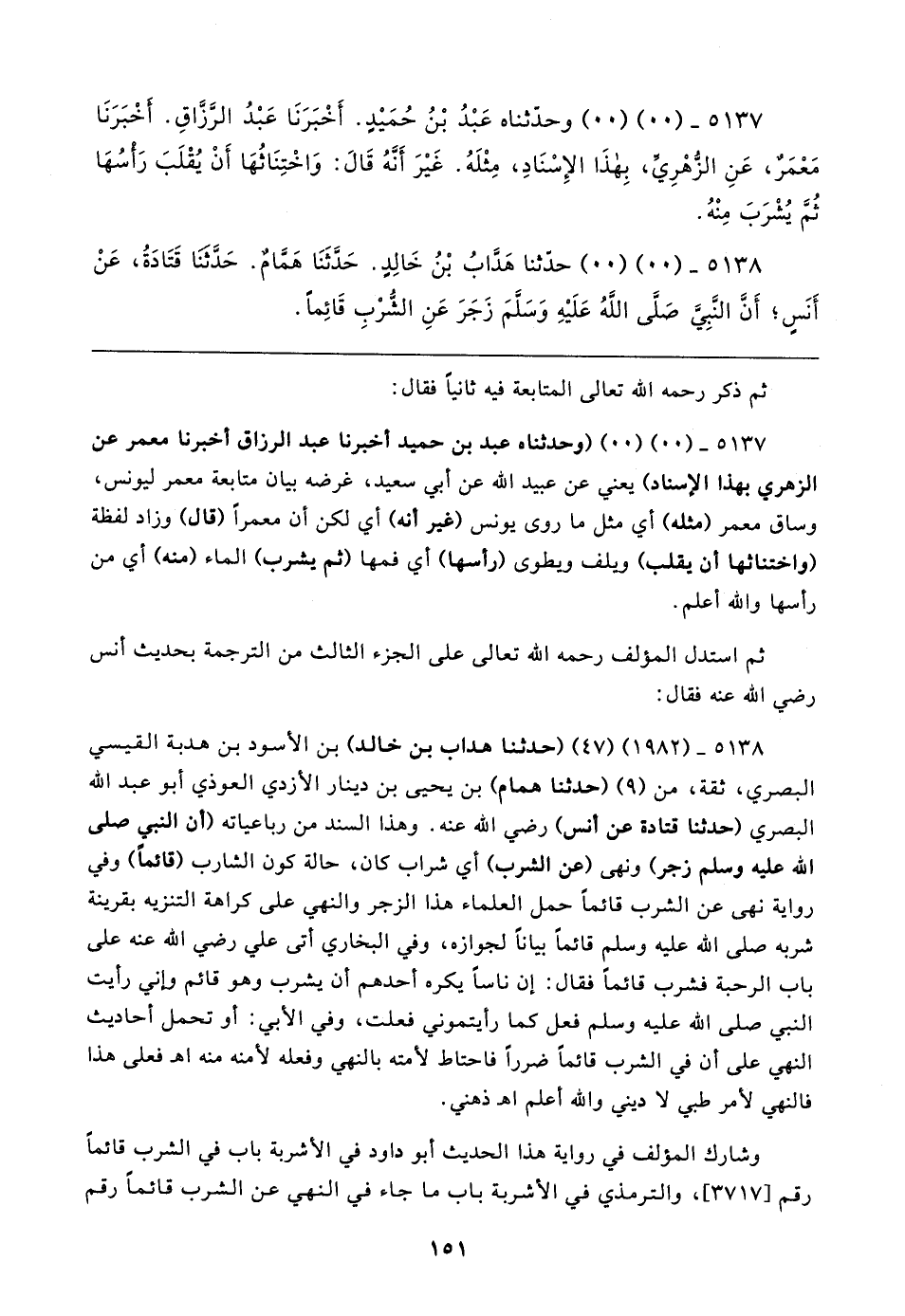 ٥١٣٨ - (٠٠) (٠٠) حدَّثنا هَدَّابُ بْنُ خَالِدٍ حَدَّثَنَا هَمَّامٌ. حَدَّثنَا قَتَادَةُ، عَنْ أَنَسٍ؛ أَنَّ النَّبِيَّ صَلَّى اللهُ عَلَيهِ وَسَلَّمَ زَجَرَ عَنِ الشُّرْبِ قَائِمًا