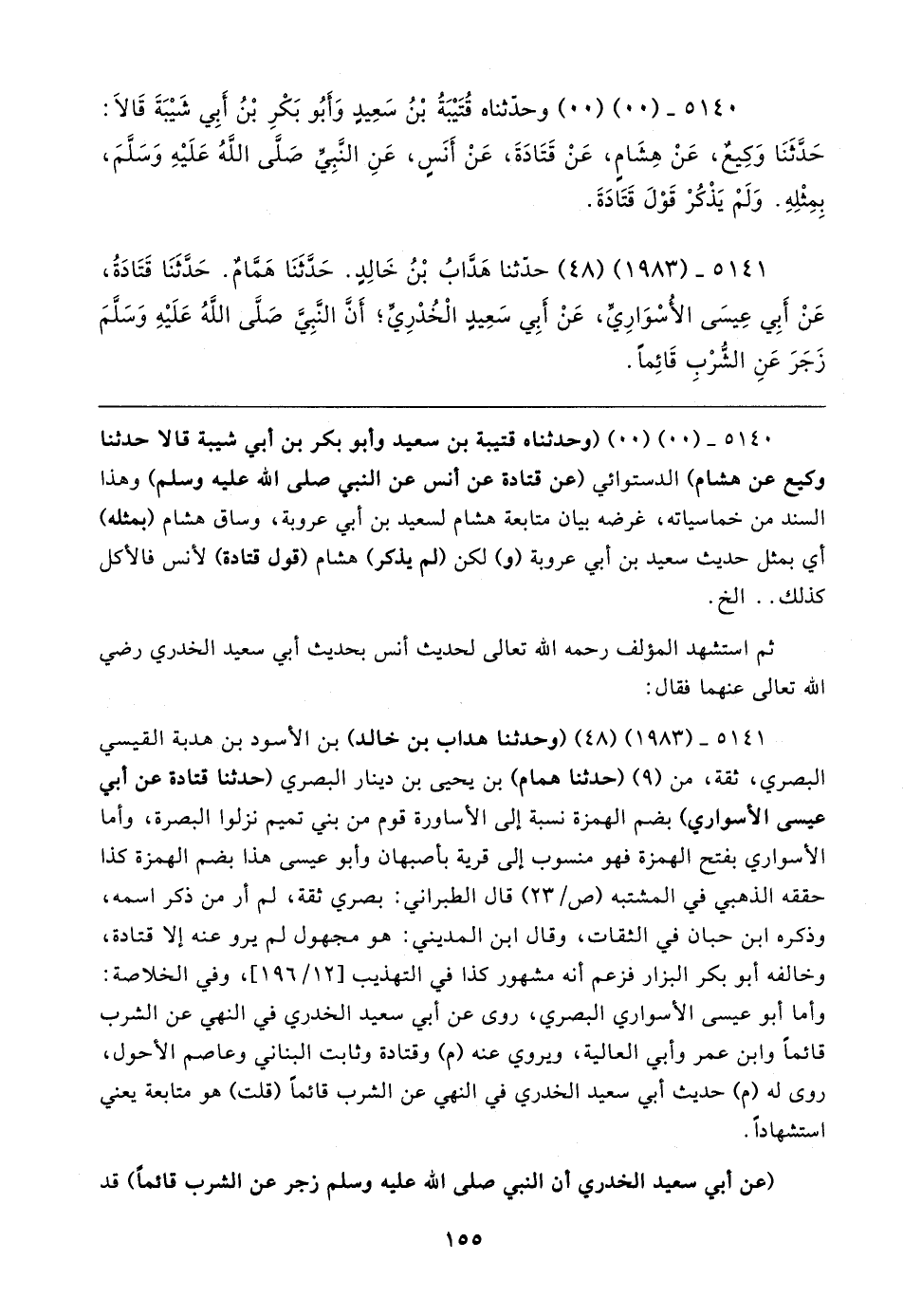 ٥١٤١ - (١٩٨٣) (٤٨) (وحدثنا هداب بن خالد) بن الأسود بن هدبة القيسي البصري، ثقة، من (٩) (حدثنا همام) بن يحيى بن دينار البصري (حدثنا قتادة عن أبي عيسى الأسواري) بضم الهمزة نسبة إلى الأساورة قوم من بني تميم نزلوا البصرة، وأما الأسواري بفتح الهمزة فهو منسوب إلى قرية بأصبهان وأبو عيسى هذا بضم الهمزة كذا حققه الذهبي في المشتبه (ص / ٢٣) قال الطبراني: بصري ثقة، لم أر من ذكر اسمه، وذكره ابن حبان في الثقات، وقال ابن المديني: هو مجهول لم يرو عنه إلَّا قتادة، وخالفه أبو بكر البزار فزعم أنه مشهور كذا في التهذيب [١٢/ ١٩٦]، وفي الخلاصة: وأما أبو عيسى الأسواري البصري، روى عن أبي سعيد الخدري في النهي عن الشرب قائمًا وابن عمر وأبي العالية، ويروي عنه (م) وقتادة وثابت البناني وعاصم الأحول، روى له (م) حديث أبي سعيد الخدري في النهي عن الشرب قائمًا (قلت) هو متابعة يعني استشهادًا.