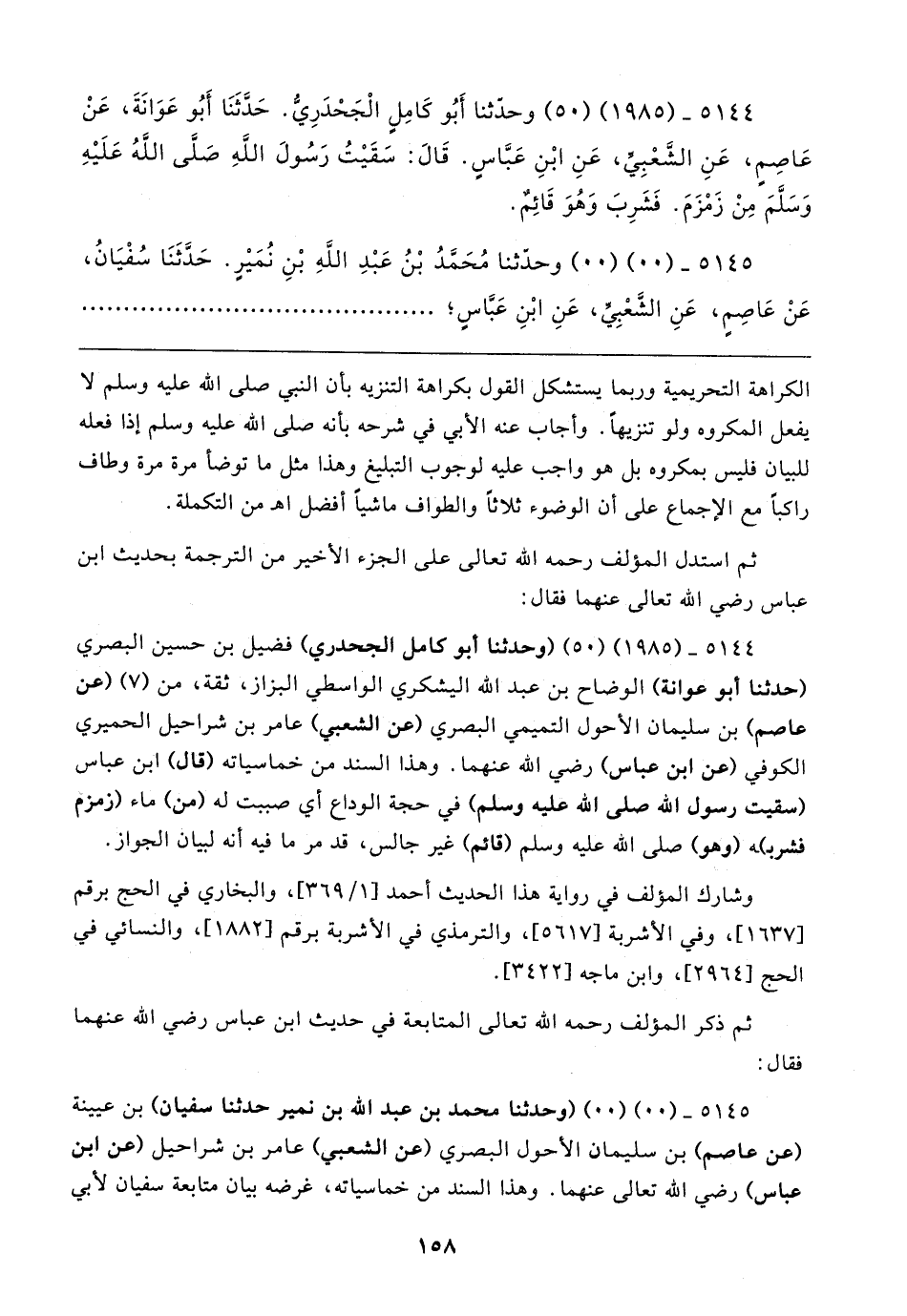 ٥١٤٥ - (٠٠) (٠٠) (وحدثنا محمد بن عبد الله بن نمير حدثنا سفيان) بن عيينة (عن عاصم) بن سليمان الأحول البصري (عن الشعبي) عامر بن شراحيل (عن ابن عباس) رضي الله تعالى عنهما. وهذا السند من خماسياته، غرضه بيان متابعة سفيان لأبي