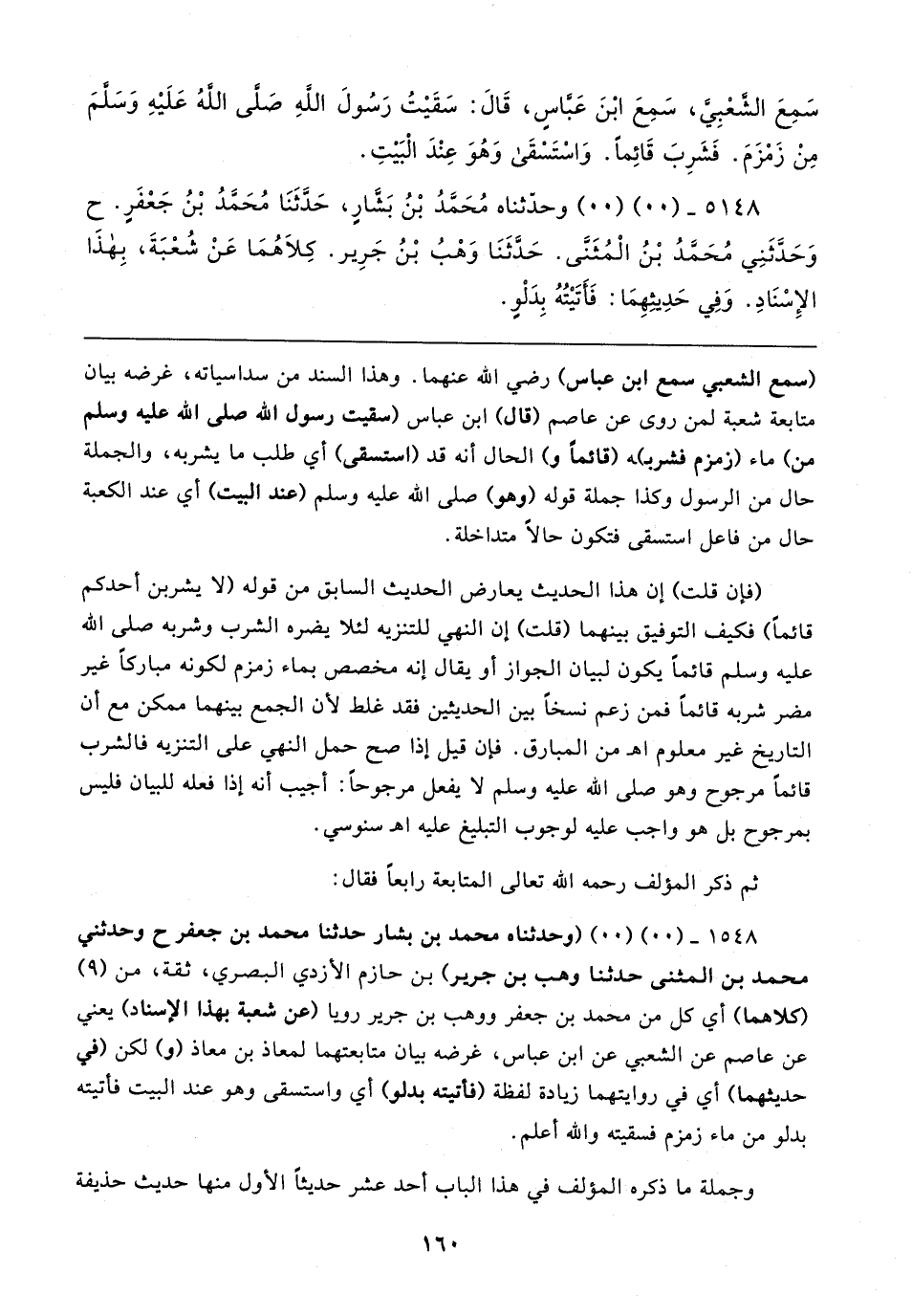 ١٥٤٨ - (٠٠) (٠٠) (وحدثناه محمد بن بشار حدثنا محمد بن جعفر ح وحدثني محمد بن المثنى حدثنا وهب بن جرير) بن حازم الأزدي البصري، ثقة، من (٩) (كلاهما) أي كل من محمد بن جعفر ووهب بن جرير رويا (عن شعبة بهذا الإسناد) يعني عن عاصم عن الشعبي عن ابن عباس، غرضه بيان متابعتهما لمعاذ بن معاذ (و) لكن (في حديثهما) أي في روايتهما زيادة لفظة (فأتيته بدلو) أي واستسقى وهو عند البيت فأتيته بدلو من ماء زمزم فسقيته والله أعلم.