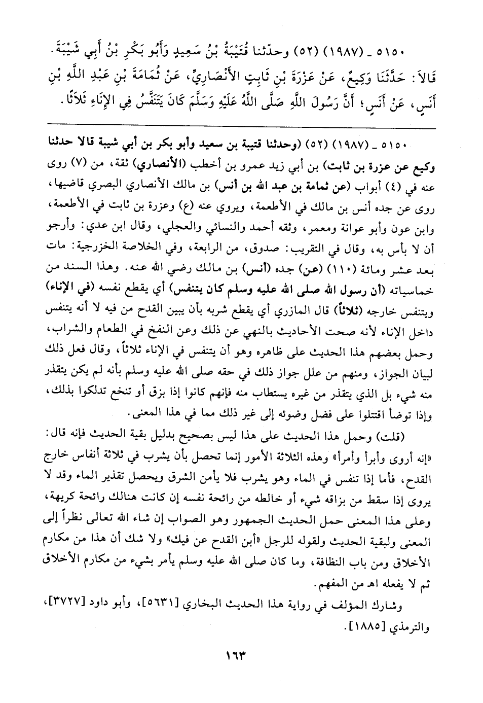 ٥١٥٠ - (١٩٨٧) (٥٢) وحدَّثنا قُتَيبَةُ بْنُ سَعِيدٍ وَأَبُو بَكْرِ بْنُ أَبِي شَيبَةَ. قَالا: حَدَّثَنَا وَكِيعٌ، عَنْ عَزْرَةَ بْنِ ثَابِتٍ الأَنْصَارِيِّ، عَنْ ثُمَامَةَ بْنِ عَبْدِ اللهِ بْنِ أَنَسٍ، عَنْ أَنَسٍ؛ أَنَّ رَسُولَ اللهِ صَلَّى اللهُ عَلَيهِ وَسَلَّمَ كَانَ يَتَنَفَّسُ فِي الإِنَاءِ ثَلاثًا