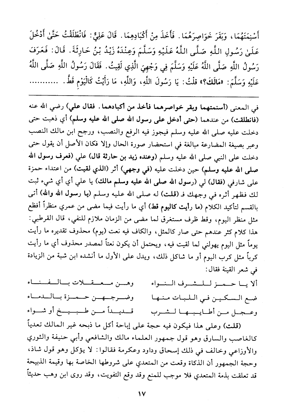 أَسْنِمَتَهُمَا، وَبَقَرَ خَوَاصِرَهُمَا. فَأخَذَ مِنْ أَكْبَادِهِمَا. قَال عَلِيُّ: فَانْطَلَقْتُ حَتى أَدْخُلَ عَلَى رَسُولِ اللهِ صَلَّى اللهُ عَلَيهِ وسلَّمَ وَعِنْدَهُ زَيدُ بْنُ حَارِثَةَ. قَال: فَعَرَفَ رَسُولُ اللهِ صَلى الله عَلَيهِ وسلَّمَ في وَجْهِيَ الّذِي لَقِيتُ. فَقَال رَسُولُ اللهِ صَلى اللهُ عَلَيهِ وسلَّمَ: "مَا لكَ؟ " قلتُ: يَا رَسُولَ اللهِ، وَاللهِ، مَا رَأَيتُ كَاليَوْمِ قَط