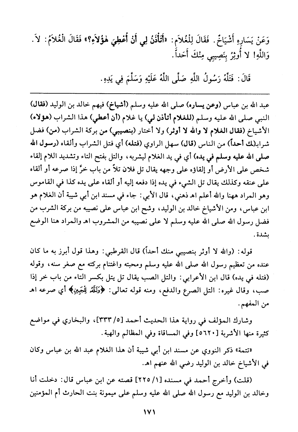 "تتمة" ذكر النووي عن مسند ابن أبي شيبة أن هذا الغلام عبد الله بن عباس وكان في الأشياخ خالد بن الوليد رضي الله عنهم اهـ.