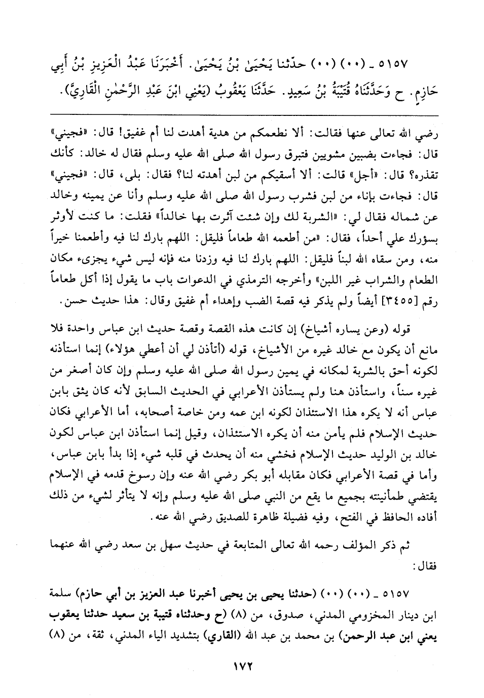 ٥١٥٧ - (٠٠) (٠٠) (حدثنا يحيى بن يحيى أخبرنا عبد العزيز بن أبي حازم) سلمة بن دينار المخزومي المدني، صدوق، من (٨) (ح وحدثناه قتيبة بن سعيد حدثنا يعقوب يعني ابن عبد الرحمن) بن محمد بن عبد الله (القاري) بتشديد الياء المدني، ثقة، من (٨)