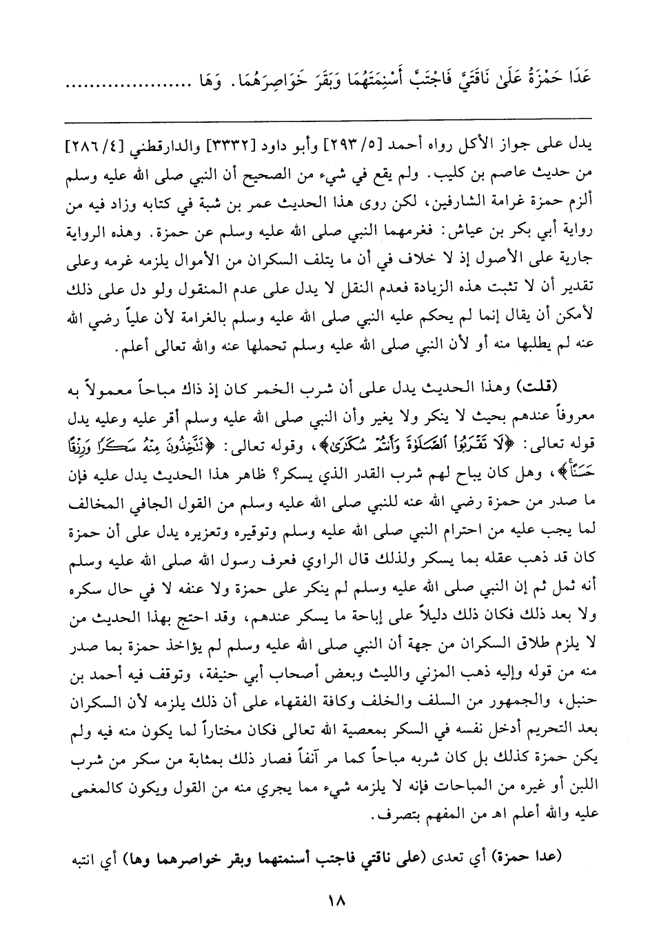 يدل على جواز الأكل رواه أَحْمد [٥/ ٢٩٣] وأبو داود [٣٣٣٢] والدارقطني [٤/ ٢٨٦] من حديث عاصم بن كليب. ولم يقع في شيء من الصحيح أن النَّبِيّ صلى الله عليه وسلم ألزم حمزة غرامة الشارفين، لكن روى هذا الحديث عمر بن شبة في كتابه وزاد فيه من رواية أبي بكر بن عياش: فغرمهما النَّبِيّ صلى الله عليه وسلم عن حمزة. وهذه الرواية جارية على الأصول إذ لا خلاف في أن ما يتلف السكران من الأموال يلزمه غرمه وعلى تقدير أن لا تثبت هذه الزيادة فعدم النقل لا يدل على عدم المنقول ولو دل على ذلك لأمكن أن يقال إنما لم يحكم عليه النَّبِيّ صلى الله عليه وسلم بالغرامة لأن عليًّا رضي الله عنه لم يطلبها منه أو لأن النَّبِيّ صلى الله عليه وسلم تحملها عنه والله تعالى أعلم.