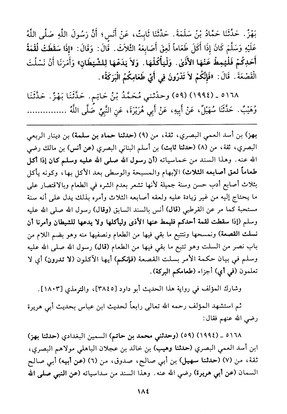 بَهْزٌ. حَدَّثَنَا حَمَّادُ بْنُ سَلَمَةَ. حَدَّثَنَا ثَابِتٌ، عَنْ أَنَسٍ؛ أَنَّ رَسُولَ اللهِ صَلَّى اللهُ عَلَيهِ وَسَلَّمَ كَانَ إِذَا أَكَلَ طَعَامًا لَعِقَ أَصَابِعَهُ الثَّلاثَ. قَال: وَقَال: "إِذَا سَقَطَتْ لُقْمَةُ أَحَدِكُمْ فَلْيُمِطْ عَنْهَا الأَذَى. وَلْيَأْكُلْهَا. وَلَا يَدَعْهَا لِلشَّيطَانِ" وَأَمَرَنَا أَنْ نَسْلُتَ الْقَصْعَةَ. قَال: "فَإِنَّكُمْ لَا تَدْرُونَ فِي أَيِّ طَعَامِكُمُ الْبَرَكَةُ".