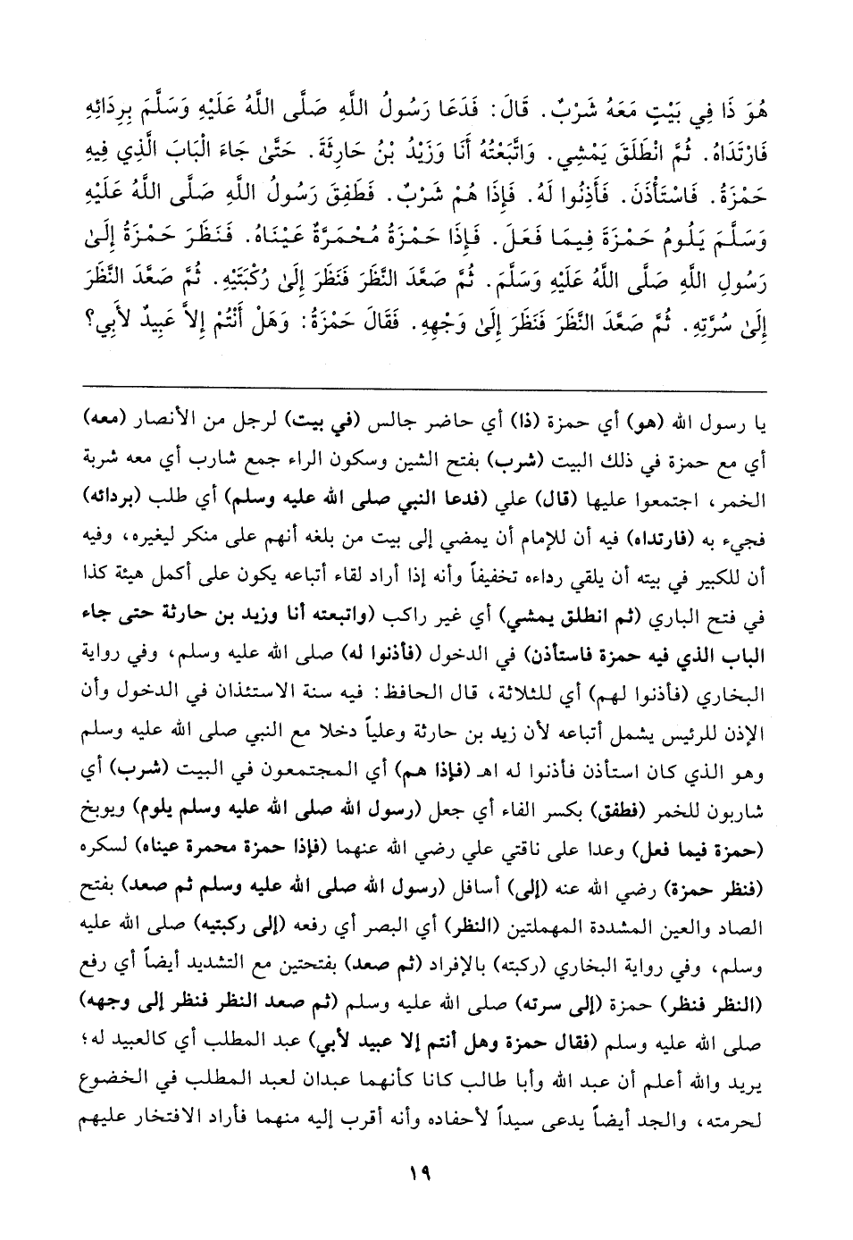 هُوَ ذَا في بَيتٍ مَعَهُ شَرْبٌ. قَال: فَدَعَا رَسُولُ اللهِ صلى الله عَلَيهِ وَسلمَ بِرِدَائِهِ فَارْتَدَاهُ. ثُمّ انْطَلَقَ يَمْشِي. وَاتَّبَعْتُهُ أَنَا وَزيدُ بْنُ حَارِثَةَ. حَتى جَاءَ البَابَ الذِي فِيهِ حَمْزَةُ. فَاسْتَأذَنَ. فَأَذِنُوا لَهُ. فَإِذَا هُمْ شَرْبٌ. فَطَفِقَ رَسُولُ اللهِ صَلى اللهُ عَلَيهِ وسلَّمَ يَلُومُ حَمْزَةَ فِيمَا فَعَلَ. فَإِذَا حَمْزَةُ مُحْمَرَّةٌ عَينَاهُ. فَنَظَرَ حَمْزَةُ إلى رَسُولِ اللهِ صَلى الله عَلَيهِ وَسلمَ. ثُمَّ صَعَّدَ النظَرَ فَنَظَرَ إلى رُكْبَتَيهِ. ثُمّ صَعَّدَ النظَرَ إلى سُرَّتِهِ. ثُمَّ صَعَّدَ النَّظَرَ فَنَظَرَ إلى وَجْهِهِ. فَقَال حَمْزَةُ: وَهَل أَنْتُمْ إلا عَبِيدٌ لأبَي؟