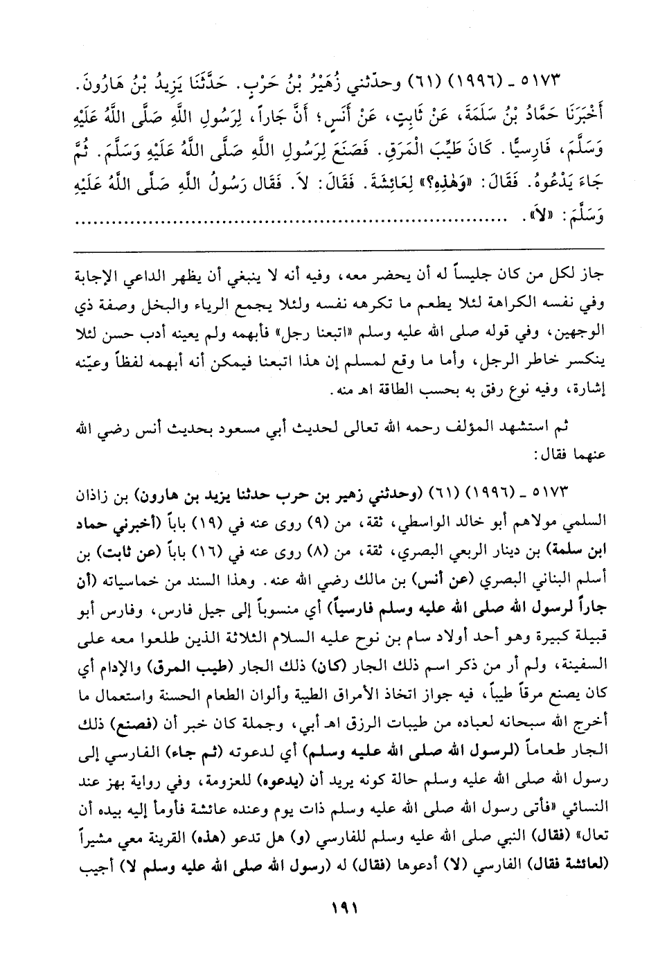 ٥١٧٣ - (٩٩٦ ١) (١ ٦) وحدَّثني زُهَيرُ بْنُ حَرْبٍ. حَدَّثَنَا يَزِيدُ بْنُ هَارُونَ. أَخْبَرَنَا حَمادُ بْنُ سَلَمَةَ، عَنْ ثَابِتٍ، عَنْ أَنَسٍ؛ أَنَّ جَارًا، لِرَسُولِ اللهِ صَلَّى اللهُ عَلَيهِ وَسَلَّمَ، فَارِسيًّا. كَانَ طَيِّبَ الْمَرَقِ. فَصَنَعَ لِرَسُولِ اللهِ صَلَّى اللهُ عَلَيهِ وسلَّمَ. ثُمَّ جَاءَ يَدْعُوهُ. فَقَال: "وَهذِهِ؟ " لِعَائِشَةَ. فَقَال: لَا. فَقَال رَسُولُ اللهِ صَلَّى اللهُ عَلَيهِ وَسَلَّمَ: "لَا"