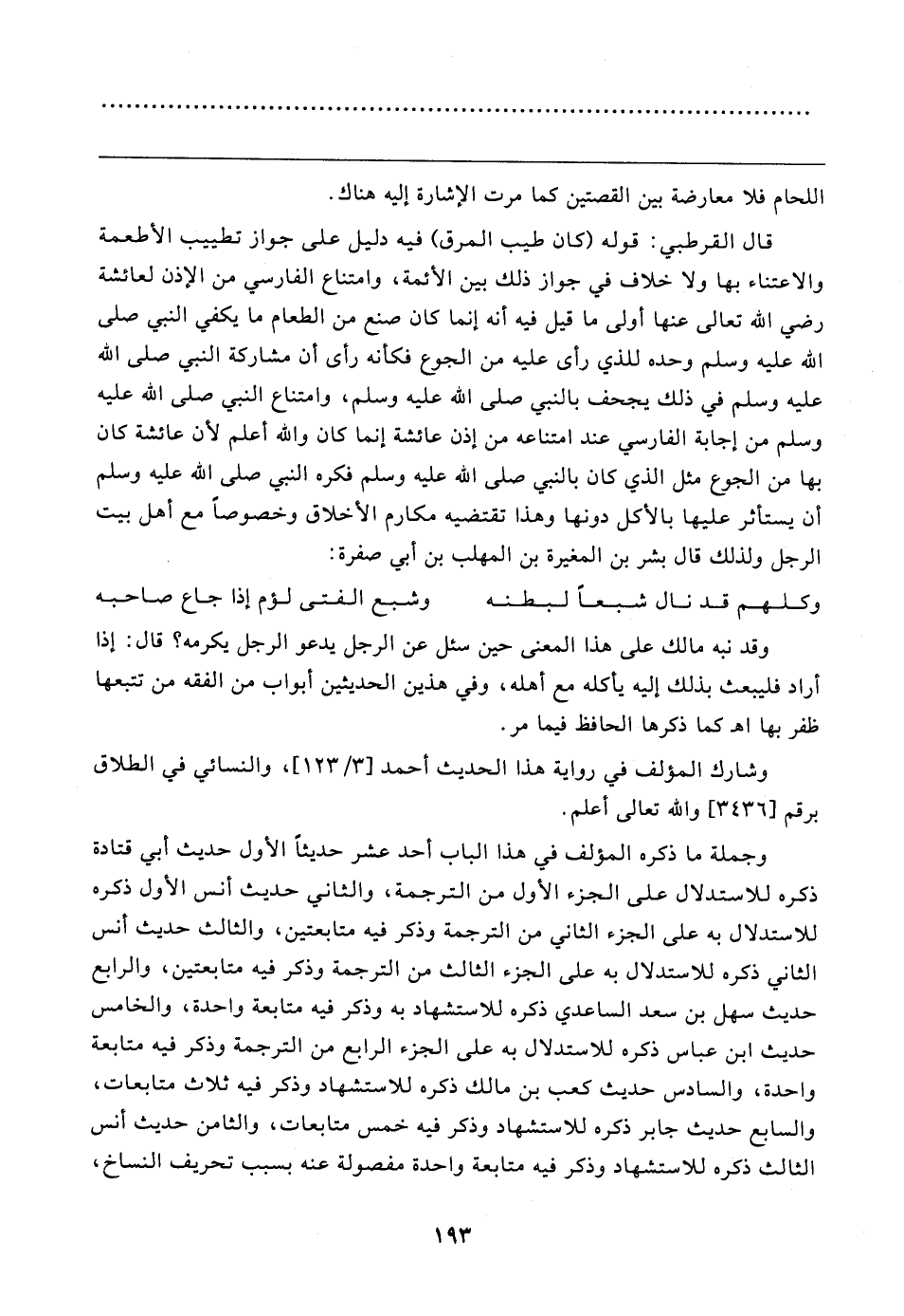 قال القرطبي: قوله (كان طيب المرق) فيه دليل على جواز تطييب الأطعمة والاعتناء بها ولا خلاف في جواز ذلك بين الأئمة، وامتناع الفارسي من الإذن لعائشة رضي الله تعالى عنها أولى ما قيل فيه أنه إنما كان صنع من الطعام ما يكفي النبي صلى الله عليه وسلم وحده للذي رأى عليه من الجوع فكأنه رأى أن مشاركة النبي صلى الله عليه وسلم في ذلك يجحف بالنبي صلى الله عليه وسلم، وامتناع النبي صلى الله عليه وسلم من إجابة الفارسي عند امتناعه من إذن عائشة إنما كان والله أعلم لأن عائشة كان بها من الجوع مثل الذي كان بالنبي صلى الله عليه وسلم فكره النبي صلى الله عليه وسلم أن يستأثر عليها بالأكل دونها وهذا تقتضيه مكارم الأخلاق وخصوصًا مع أهل بيت الرجل ولذلك قال بشر بن المغيرة بن المهلب بن أبي صفرة: