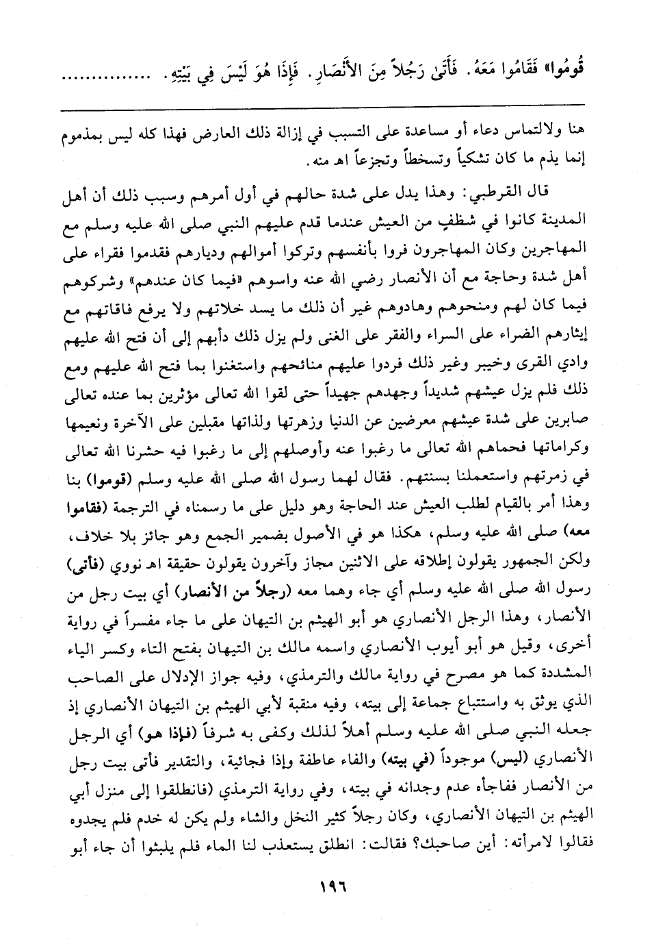 قال القرطبي: وهذا يدل على شدة حالهم في أول أمرهم وسبب ذلك أن أهل المدينة كانوا في شظفٍ من العيش عندما قدم عليهم النبي صلى الله عليه وسلم مع المهاجرين وكان المهاجرون فروا بأنفسهم وتركوا أموالهم وديارهم فقدموا فقراء على أهل شدة وحاجة مع أن الأنصار رضي الله عنه واسوهم "فيما كان عندهم" وشركوهم فيما كان لهم ومنحوهم وهادوهم غير أن ذلك ما يسد خلاتهم ولا يرفع فاقاتهم مع إيثارهم الضراء على السراء والفقر على الغنى ولم يزل ذلك دأبهم إلى أن فتح الله عليهم وادي القرى وخيبر وغير ذلك فردوا عليهم منائحهم واستغنوا بما فتح الله عليهم ومع ذلك فلم يزل عيشهم شديدأوجهدهم جهيدًا حتى لقوا الله تعالى مؤثرين بما عنده تعالى صابرين على شدة عيشهم معرضين عن الدنيا وزهرتها ولذاتها مقبلين على الآخرة ونعيمها وكراماتها فحماهم الله تعالى ما رغبوا عنه وأوصلهم إلى ما رغبوا فيه حشرنا الله تعالى في زمرتهم واستعملنا بسنتهم. فقال لهما رسول الله صلى الله عليه وسلم (قوموا) بنا وهذا أمر بالقيام لطلب العيش عند الحاجة وهو دليل على ما رسمناه في الترجمة (فقاموا معه) صلى الله عليه وسلم، هكذا هو في الأصول بضمير الجمع وهو جائز بلا خلاف، ولكن الجمهور يقولون إطلاقه على الاثنين مجاز وآخرون يقولون حقيقة اهـ نووي (فأتى) رسول الله صلى الله عليه وسلم أي جاء وهما معه (رجلًا من الأنصار) أي بيت رجل من الأنصار، وهذا الرجل الأنصاري هو أبو الهيثم بن التيهان على ما جاء مفسرًا في رواية أخرى، وقيل هو أبو أيوب الأنصاري واسمه مالك بن التيهان بفتح التاء وكسر الياء المشددة كما هو مصرح في رواية مالك والترمذي، وفيه جواز الإدلال على الصاحب الذي يوثق به واستتباع جماعة إلى بيته، وفيه منقبة لأبي الهيثم بن التيهان الأنصاري إذ جعله النبي صلى الله عليه وسلم أهلًا لذلك وكفى به شرفًا (فهذا هو) أي الرجل الأنصاري (ليس) موجودًا (في بيته) والفاء عاطفة وإذا فجائية، والتقدير فأتى بيت رجل من الأنصار ففاجأه عدم وجدانه في بيته، وفي رواية الترمذي (فانطلقوا إلى منزل أبي الهيثم بن التيهان الأنصاري، وكان رجلًا كثير النخل والشاء ولم يكن له خدم فلم يجدوه فقالوا لامرأته: أين صاحبك؟ فقالت: انطلق يستعذب لنا الماء فلم يلبثوا أن جاء أبو