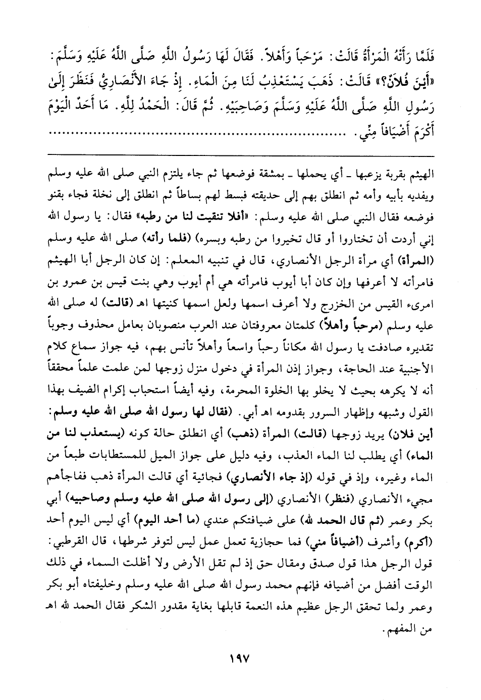 فَلَمَّا رَأَتْهُ الْمَرْأَةُ قَالتْ: مَرْحَبًا وَأَهْلًا. فَقَال لَهَا رَسُولُ اللهِ صَلَّى اللهُ عَلَيهِ وَسلَّمَ: "أَينَ فُلان؟ " قَالتْ: ذَهَبَ يَسْتَعْذِبُ لَنَا مِنَ الْمَاءِ. إِذْ جَاءَ الأنصَارِيُّ فَنَظَرَ إِلَى رَسُولِ اللهِ صَلَّى اللهُ عَلَيهِ وَسلَّمَ وَصَاحِبَيهِ. ثُمَّ قَال: الْحَمْدُ لِلَّهِ. مَا أَحَدٌ الْيَوْمَ أَكْرَمَ أَضْيَافًا مِنِّي