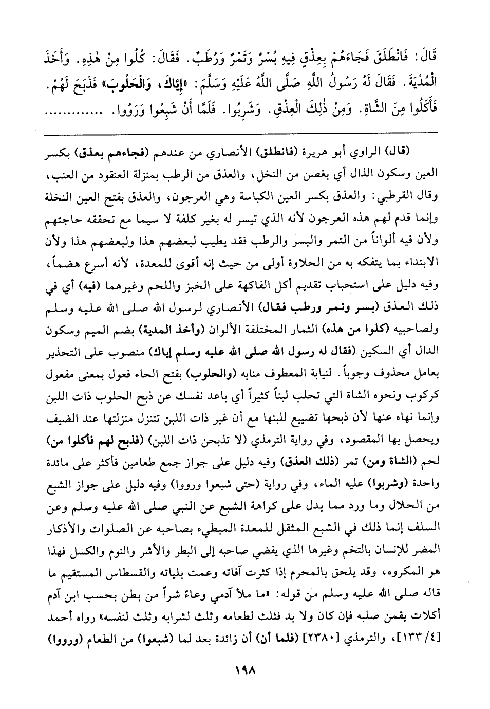(قال) الراوي أبو هريرة (فانطلق) الأنصاري من عندهم (فجاءهم بعذق) بكسر العين وسكون الذال أي بغصن من النخل، والعذق من الرطب بمنزلة العنقود من العنب، وقال القرطبي: والعذق بكسر العين الكباسة وهي العرجون، والعذق بفتح العين النخلة وإنما قدم لهم هذه العرجون لأنه الذي تيسر له بغير كلفة لا سيما مع تحققه حاجتهم ولأن فيه ألوانًا من التمر والبسر والرطب فقد يطيب لبعضهم هذا ولبعضهم هذا ولأن الابتداء بما يتفكه به من الحلاوة أولى من حيث إنه أقوى للمعدة؛ لأنه أسرع هضمًا، وفيه دليل على استحباب تقديم أكل الفاكهة على الخبز واللحم وغيرهما (فيه) أي في ذلك العذق (بسر وتمر ورطب فقال) الأنصاري لرسول الله صلى الله عليه وسلم ولصاحبيه (كلوا من هذه) الثمار المختلفة الألوان (وأخذ المدية) بضم الميم وسكون الدال أي السكين (فقال له رسول الله صلى الله عليه وسلم إياك) منصوب على التحذير بعامل محذوف وجوبًا. لنيابة المعطوف منابه (والحلوب) بفتح الحاء فعول بمعنى مفعول كركوب ونحوه الشاة التي تحلب لبنًا كثيرًا أي باعد نفسك عن ذبح الحلوب ذات اللبن وإنما نهاه عنها لأن ذبحها تضييع للبنها مع أن غير ذات اللبن تتنزل منزلتها عند الضيف ويحصل بها المقصود، وفي رواية الترمذي (لا تذبحن ذات اللبن) (فذبح لهم فأكلوا من) لحم (الشاة ومن) تمر (ذلك العذق) وفيه دليل على جواز جمع طعامين فأكثر على مائدة واحدة (وشربوا) عليه الماء، وفي رواية (حتى شبعوا ورووا) وفيه دليل على جواز الشبع من الحلال وما ورد مما يدل على كراهة الشبع عن النبي صلى الله عليه وسلم وعن السلف إنما ذلك في الشبع المثقل للمعدة المبطيء بصاحبه عن الصلوات والأذكار المضر للإنسان بالتخم وغيرها الذي يفضي صاحبه إلى البطر والأشر والنوم والكسل فهذا هو المكروه، وقد يلحق بالمحرم إذا كثرت آفاته وعمت بلياته والقسطاس المستقيم ما قاله صلى الله عليه وسلم من قوله: "ما ملأ آدمي وعاءً شرًّا من بطن بحسب ابن آدم أكلات يقمن صلبه فإن كان ولا بد فثلث لطعامه وثلث لشرابه وثلث لنفسه" رواه أحمد [٤/ ١٣٣] والترمذي [٢٣٨٠] (فلما أن) أن زائدة بعد لما (شبعوا) من الطعام (ورووا)