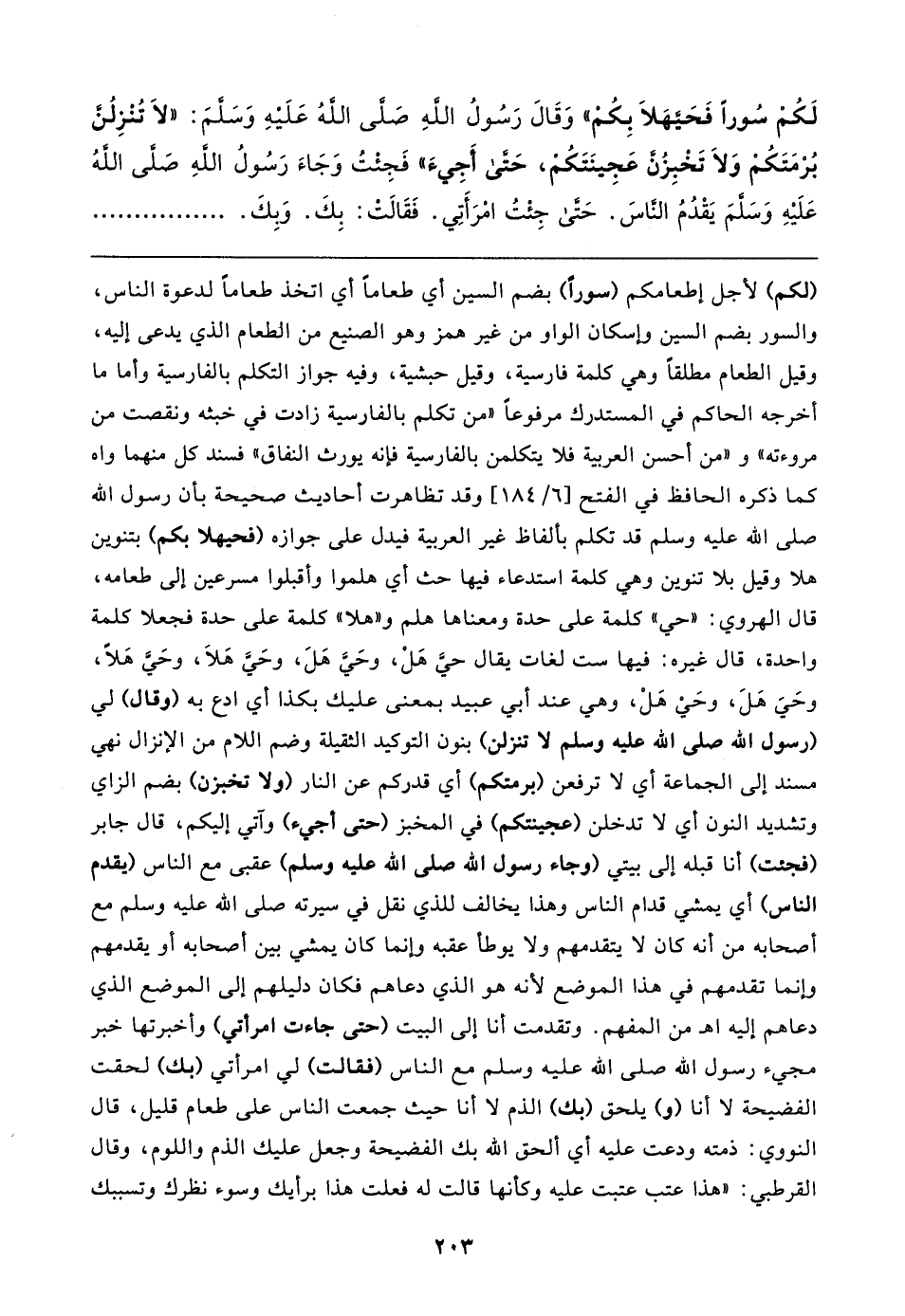 لَكُمْ سُورًا فَحَيَّهَلا بِكُمْ" وَقَال رَسُولُ اللهِ صَلَّى اللهُ عَلَيهِ وَسَلَّمَ: "لَا تُنْزِلُنَّ بُرْمَتَكُمْ وَلَا تَخْبِزُنَّ عَجِينَتَكُمْ، حَتَّى أَجِيءَ" فَجِئْتُ وَجَاءَ رَسُولُ اللهِ صَلَّى اللهُ عَلَيهِ وَسَلَّمَ يَقْدُمُ النَّاسَ. حَتَّى جِئْتُ امْرَأَتِي. فَقَالت: بِكَ. وَبِكَ