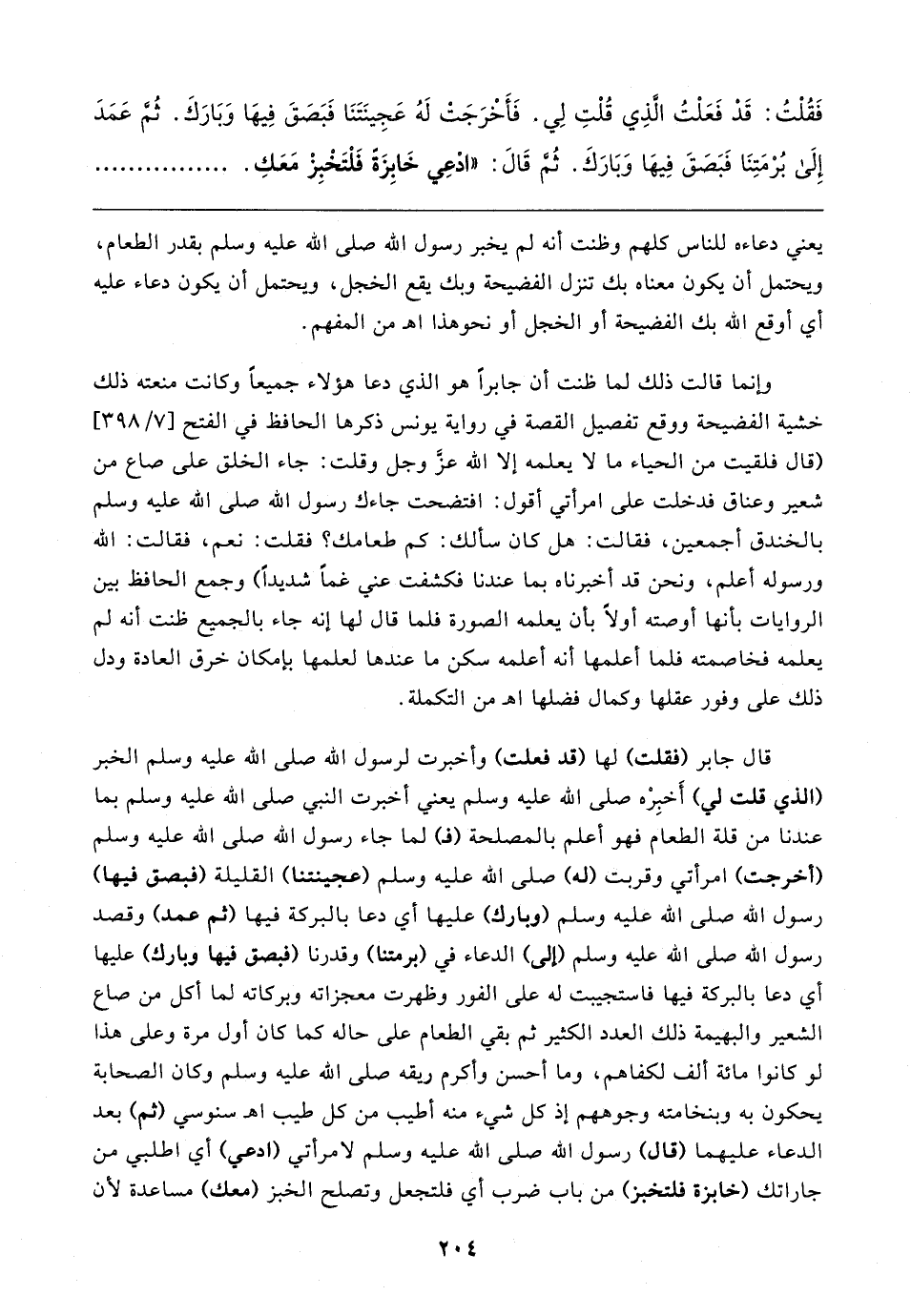 قال جابر (فقلت) لها (قد فعلت) وأخبرت لرسول الله صلى الله عليه وسلم الخبر (الذي قلت لي) أَخبِرْه صلى الله عليه وسلم يعني أخبرت النبي صلى الله عليه وسلم بما عندنا من قلة الطعام فهو أعلم بالمصلحة (ف) لما جاء رسول الله صلى الله عليه وسلم (أخرجت) امرأتي وقربت (له) صلى الله عليه وسلم (عجينتنا) القليلة (فبصق فيها) رسول الله صلى الله عليه وسلم (وبارك) عليها أي دعا بالبركة فيها (ثم عمد) وقصد رسول الله صلى الله عليه وسلم (إلى) الدعاء في (برمتنا) وقدرنا (فبصق فيها وبارك) عليها أي دعا بالبركة فيها فاستجيبت له على الفور وظهرت معجزاته وبركاته لما أكل من صاع الشعير والبهيمة ذلك العدد الكثير ثم بقي الطعام على حاله كما كان أول مرة وعلى هذا لو كانوا مائة ألف لكفاهم، وما أحسن وأكرم ريقه صلى الله عليه وسلم وكان الصحابة يحكون به وبنخامته وجوههم إذ كل شيء منه أطيب من كل طيب اهـ سنوسي (ثم) بعد الدعاء عليهما (قال) رسول الله صلى الله عليه وسلم لامرأتي (ادعي) أي اطلبي من جاراتك (خابزة فلتخبز) من باب ضرب أي فلتجعل وتصلح الخبز (معك) مساعدة لأن