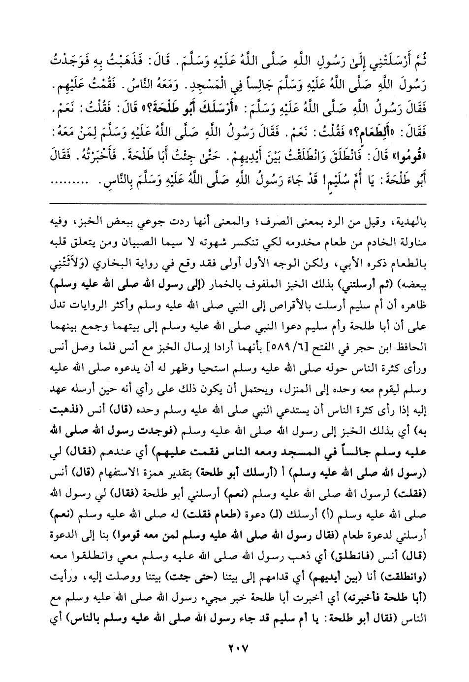 ثُمَّ أَرْسَلَتْنِي إلى رَسُولِ اللهِ صَلَّى اللهُ عَلَيهِ وَسَلَّمَ. قَال: فَذَهَبْتُ بِهِ فَوَجَدْتُ رَسُولَ اللهِ صَلَّى اللهُ عَلَيهِ وَسَلَّمَ جَالِسًا في الْمَسْجِدِ. وَمَعَهُ النَّاسُ. فَقُمْتُ عَلَيهِم. فَقَال رَسُولُ اللهِ صَلَّى اللهُ عَلَيهِ وَسَلَّمَ: "أَرْسَلَكَ أَبُو طَلْحَةَ؟ " قَال: فَقُلْتُ: نَعَمْ. فَقَال: "أَلِطَعَامٍ؟ " فَقُلْتُ: نَعَمْ. فَقَال رَسُولُ اللهِ صَلَّى اللهُ عَلَيهِ وَسَلَّمَ لِمَنْ مَعَهُ: "قُومُوا" قَال: فَانْطَلَقَ وَانْطَلَقْتُ بَينَ أَيدِيهِمْ. حَتَّى جِئْتُ أَبَا طَلْحَةَ. فَأَخْبَرْتُهُ. فَقَال أَبُو طَلْحَةَ: يَا أُمَّ سُلَيمٍ! قَدْ جَاءَ رَسُولُ اللهِ صَلَّى اللهُ عَلَيهِ وَسَلَّمَ بِالنَّاسِ