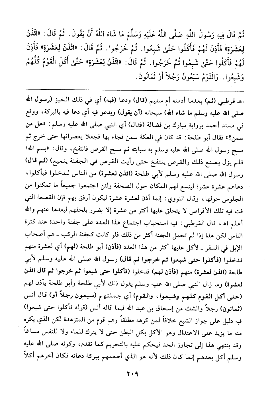 ثُمَّ قَال فِيهِ رَسُولُ اللهِ صَلَّى اللهُ عَلَيهِ وَسَلَّمَ مَا شَاءَ اللهُ أَنْ يَقُولَ. ثُمَّ قَال: "ائْذَنْ لِعَشَرَةٍ" فَأَذِنَ لَهُمْ فَأَكَلُوا حَتَّى شَبِعُوا. ثُمَّ خَرَجُوا. ثُمَّ قَال: "ائْذَنْ لِعَشَرَةٍ" فَأَذِنَ لَهُمْ فَأَكَلُوا حَتَّى شَبِعُوا ثُمَّ خَرَجُوا. ثُمَّ قَال: "ائْذَنْ لِعَشَرَةِ" حَتَّى أَكَلَ الْقَوْمُ كُلُّهُمْ وَشَبِعُوا. وَالْقَوْمُ سَبْعُونَ رَجُلًا أَوْ ثَمَانُونَ