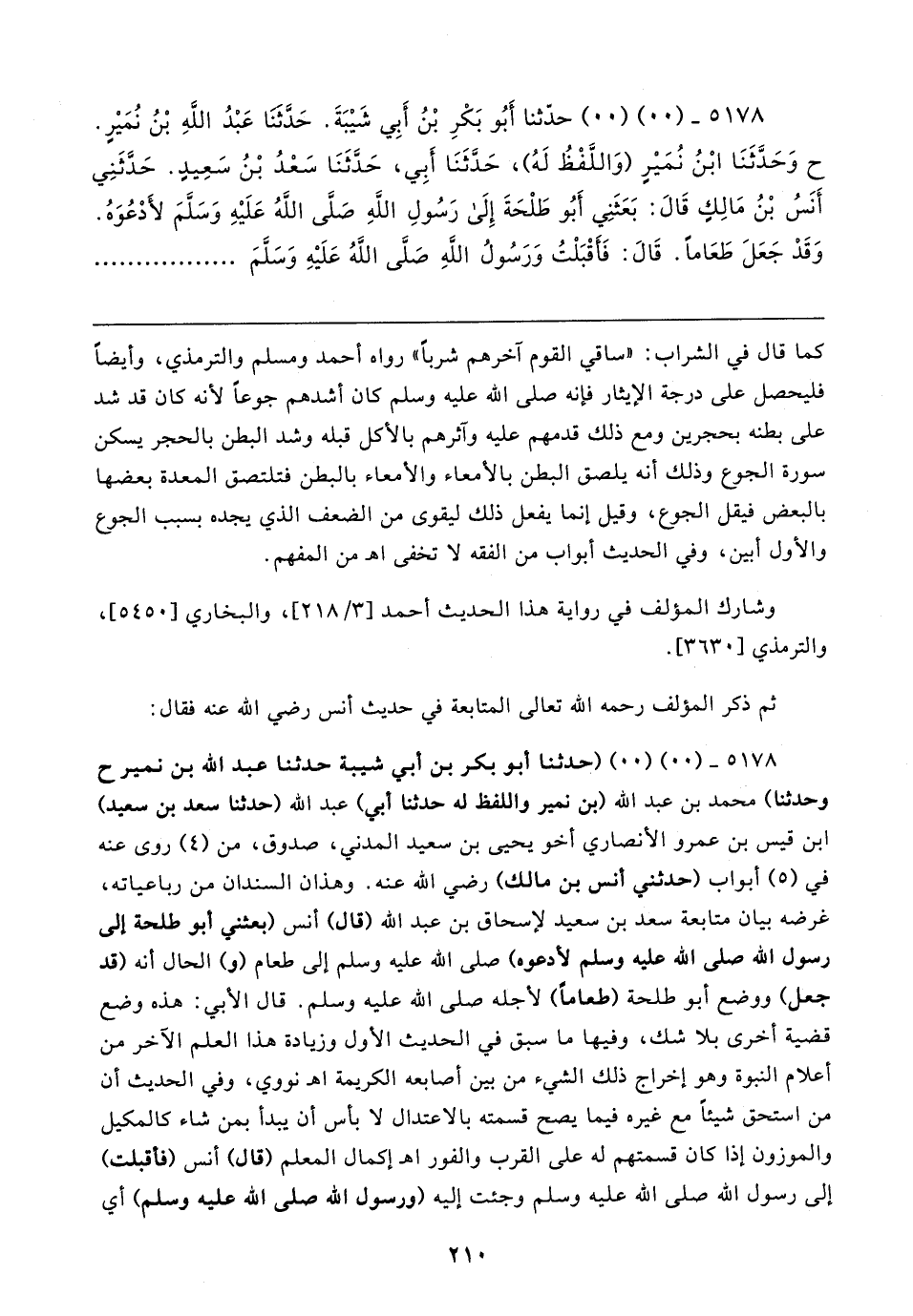 ٥١٧٨ - (٠٠) (٠٠) حدَّثنا أَبُو بَكْرِ بْنُ أَبِي شَيبَةَ. حَدَّثَنَا عَبْدُ اللهِ بْنُ نُمَيرٍ. ح وَحَدَّثَنَا ابْنُ نُمَيرٍ (وَاللَّفْظُ لَهُ)، حَدَّثَنَا أَبِي، حَدَّثَنَا سَعْدُ بْنُ سَعِيدٍ. حَدَّثَنِي أَنَسُ بْنُ مَالِكٍ قَال: بَعَثَنِي أَبُو طَلْحَةَ إِلَى رَسُولِ اللهِ صَلَّى اللهُ عَلَيهِ وَسَلَّمَ لأَدْعُوَهُ. وَقَدْ جَعَلَ طَعَامًا. قَال: فَأَقْبَلْتُ وَرَسُولُ اللهِ صَلَّى اللهُ عَلَيهِ وَسَلَّمَ