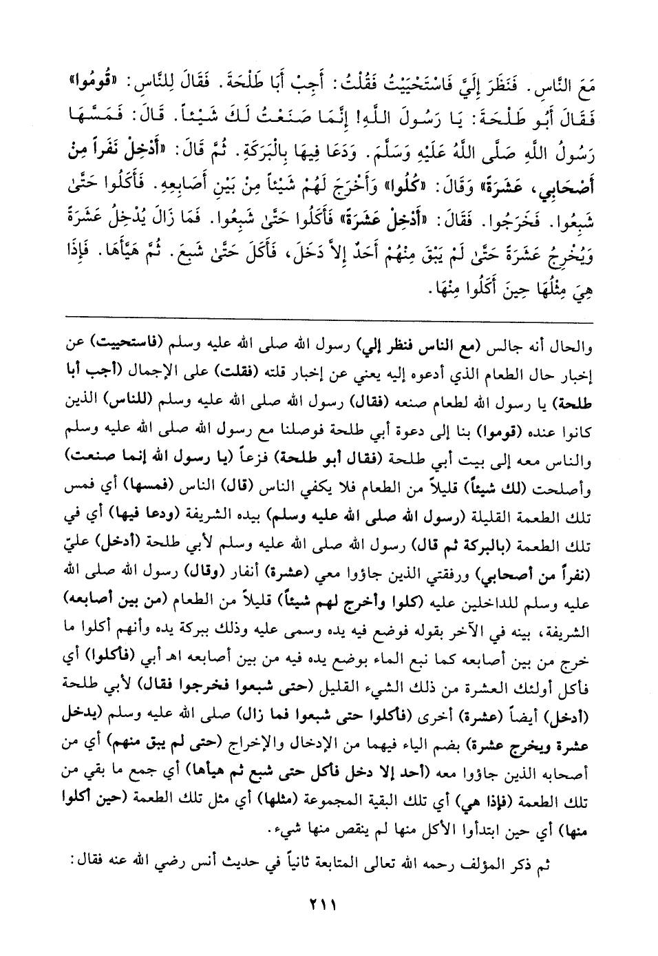 مَعَ النَّاسِ. فَنَظَرَ إِلَيَّ فَاسْتَحْيَيتُ فَقُلْتُ: أَجِبْ أَبَا طَلْحَةَ. فَقَال لِلنَّاسِ: "قُومُوا" فَقَال أَبُو طَلْحَةَ: يَا رَسُولَ اللهِ! إِنَّما صَنَعْتُ لَكَ شَيئًا. قَال: فَمَسَّهَا رَسُولُ اللهِ صَلَّى اللهُ عَلَيهِ وَسَلَّمَ. وَدَعَا فِيهَا بِالْبَرَكَةِ. ثُمَّ قَال: "أَدْخِلْ نَفَرًا مِنْ أَصْحَابِي، عَشَرَةً" وَقَال: "كُلُوا" وَأَخْرَجَ لَهُمْ شَيئًا مِنْ بَينِ أَصَابِعِهِ. فَأَكَلُوا حَتَّى شَبِعُوا. فَخَرَجُوا. فَقَال: "أَدْخِلْ عَشَرَةً" فَأَكَلُوا حَتى شَبِعُوا. فَمَا زَال يُدْخِلُ عَشَرَةً وَيُخْرِجُ عَشَرَةً حَتى لَمْ يَبْقَ مِنْهُمْ أحدٌ إلا دَخَلَ، فَأَكَلَ حَتَّى شَبعَ. ثُمَّ هَيَّأَهَا. فَإِذَا هِيَ مِثْلُهَا حِينَ أَكَلُوا مِنْهَا