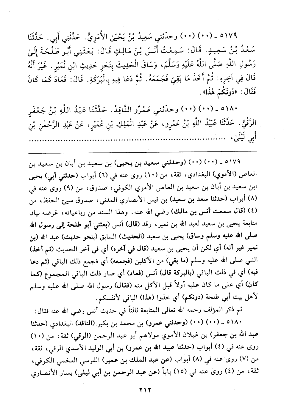 ٥١٧٩ - (٠٠) (٠٠) (وحدثني سعيد بن يحيى) بن سعيد بن أبان بن سعيد بن العاص (الأموي) البغدادي، ثقة، من (١٠) روى عنه في (٦) أبواب (حدثني أبي) يحيى ابن سعيد بن أبان بن سعيد بن العاص الأموي الكوفي، صدوق، من (٩) روى عنه في (٨) أبواب (حدثنا سعد بن سعيد) بن قيس الأنصاري المدني، صدوق سيئ الحفظ، من (٤) (قال سمعت أنس بن مالك) رضي الله عنه. وهذا السند من رباعياته، غرضه بيان متابعة يحيى بن سعيد لعبد الله بن نمير، وقد (قال) أنس (بعثني أبو طلحة إلى رسول الله صلى الله عليه وسلم وساق) يحيى بن سعيد (الحديث) السابق (بنحو حديث) عبد الله (بن نمير غير أنه) أي لكن أن يحيى بن سعيد (قال في آخره) أي في آخر الحديث (ثم أخذ) النبي صلى الله عليه وسلم (ما بقي) من الآكلين (فجمعه) أي فجمع ذلك الباقي (ثم دعا فيه) أي في ذلك الباقي (بالبركة قال) أنس (فعاد) أي صار ذلك الباقي المجموع (كما كان) أي على ما كان عليه أولًا قبل الأكل منه (فقال) رسول الله صلى الله عليه وسلم لأهل بيت أبي طلحة (دونكم) أي خذوا (هذا) الباقي لأنفسكم.