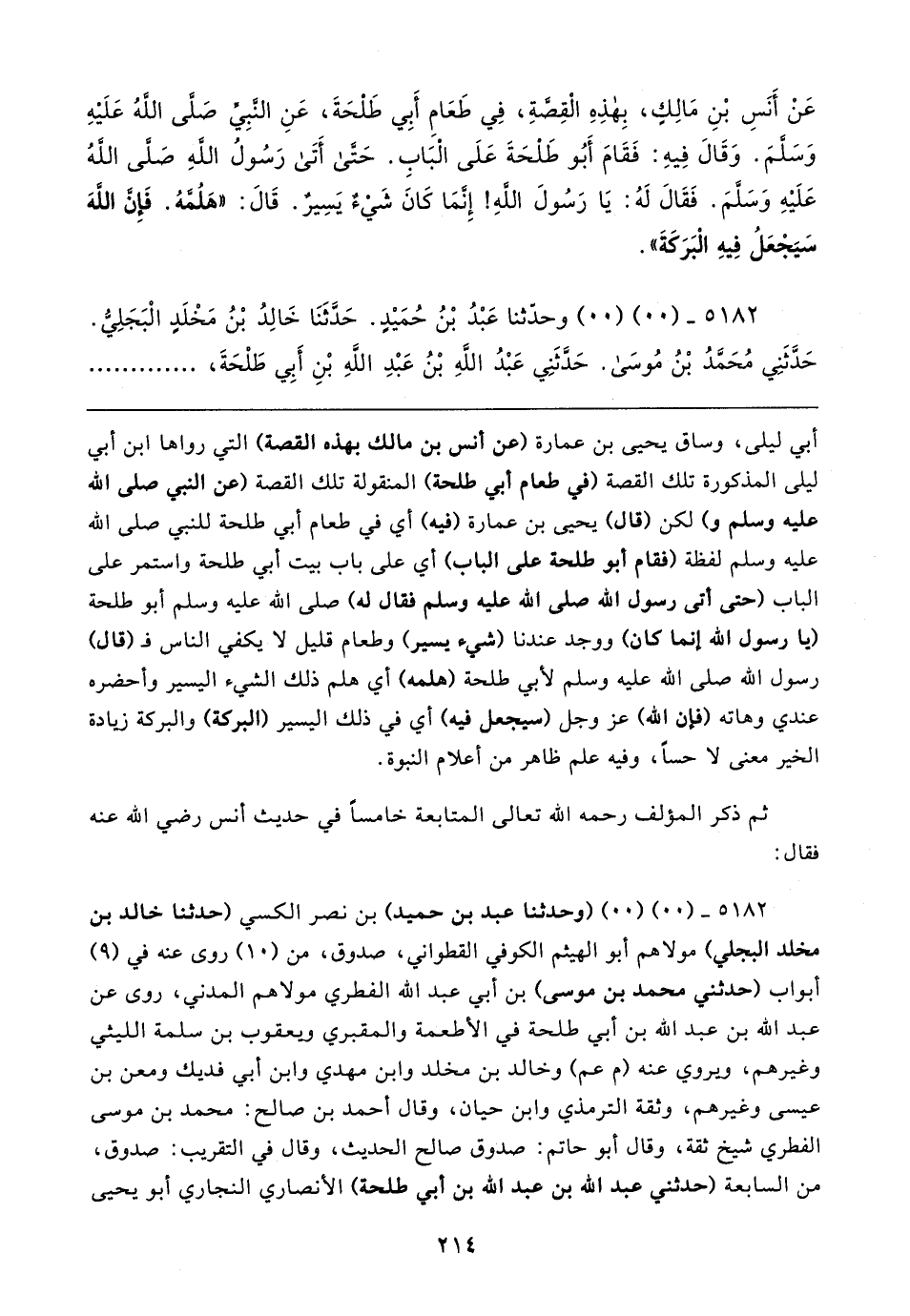 ٥١٨٢ - (٠٠) (٠٠) وحدّثنا عَبْدُ بْنُ حُمَيدٍ. حَدَّثَنَا خَالِدُ بْنُ مَخْلَدٍ الْبَجَلِيُّ. حَدَّثَنِي مُحَمَّدُ بْنُ مُوسَى. حَدَّثَنِي عَبْدُ اللهِ بْنُ عَبْدِ اللهِ بْنِ أبي طَلْحَةَ،