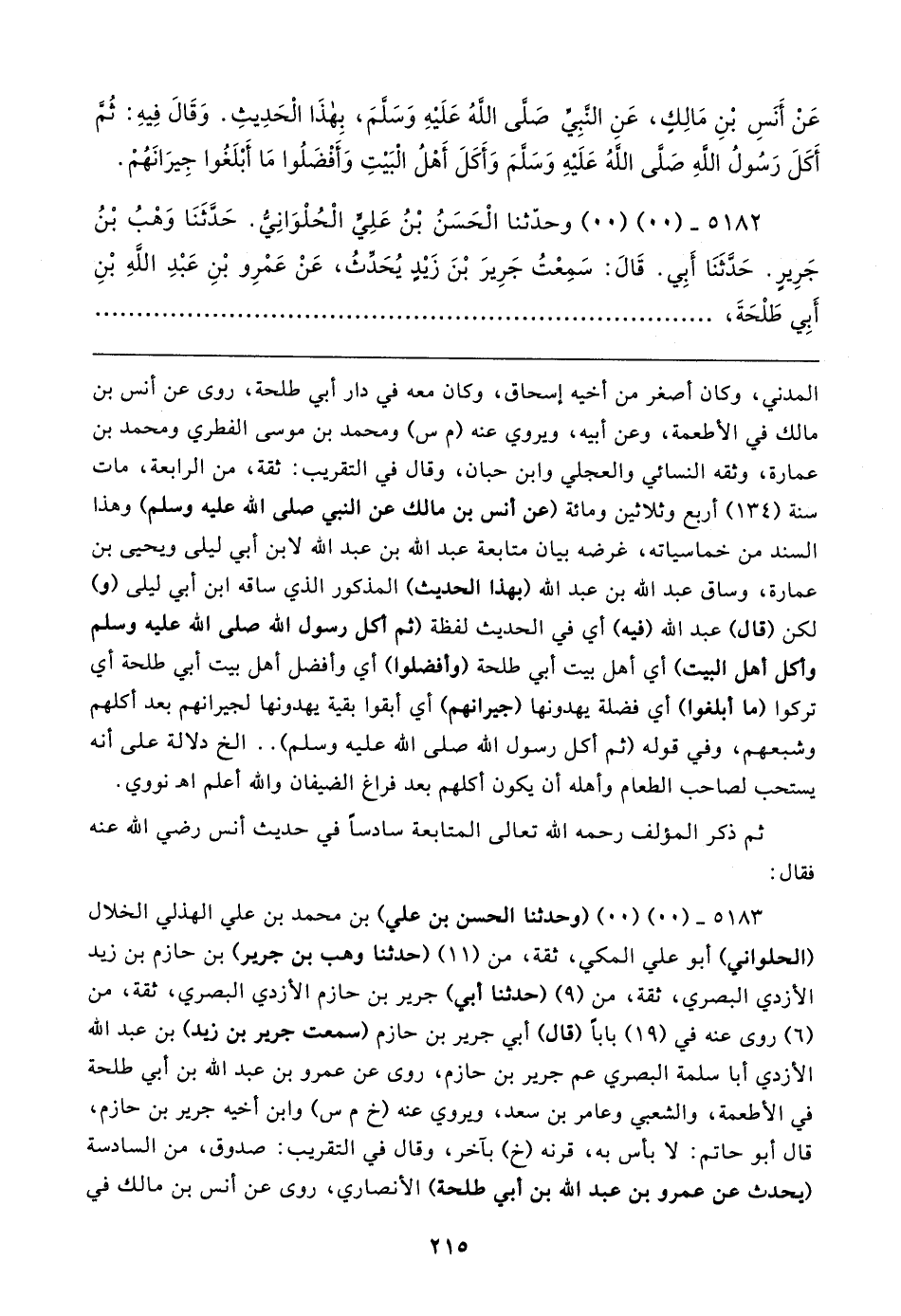 ٥١٨٣ - (٠٠) (٠٠) (وحدثنا الحسن بن علي) بن محمد بن علي الهذلي الخلال (الحلواني) أبو علي المكي، ثقة، من (١١) (حدثنا وهب بن جرير) بن حازم بن زيد الأزدي البصري، ثقة، من (٩) (حدثنا أبي) جرير بن حازم الأزدي البصري، ثقة، من (٦) روى عنه في (١٩) بابا (قال) أبي جرير بن حازم (سمعت جرير بن زيد) بن عبد الله الأزدي أبا سلمة البصري عم جرير بن حازم، روى عن عمرو بن عبد الله بن أبي طلحة في الأطعمة، والشعبي وعامر بن سعد، ويروي عنه (خ م س) وابن أخيه جرير بن حازم، قال أبو حاتم: لا بأس به، قرنه (خ) بآخر، وقال في التقريب: صدوق، من السادسة (يحدث عن عمرو بن عبد الله بن أبي طلحة) الأنصاري، روى عن أنس بن مالك في