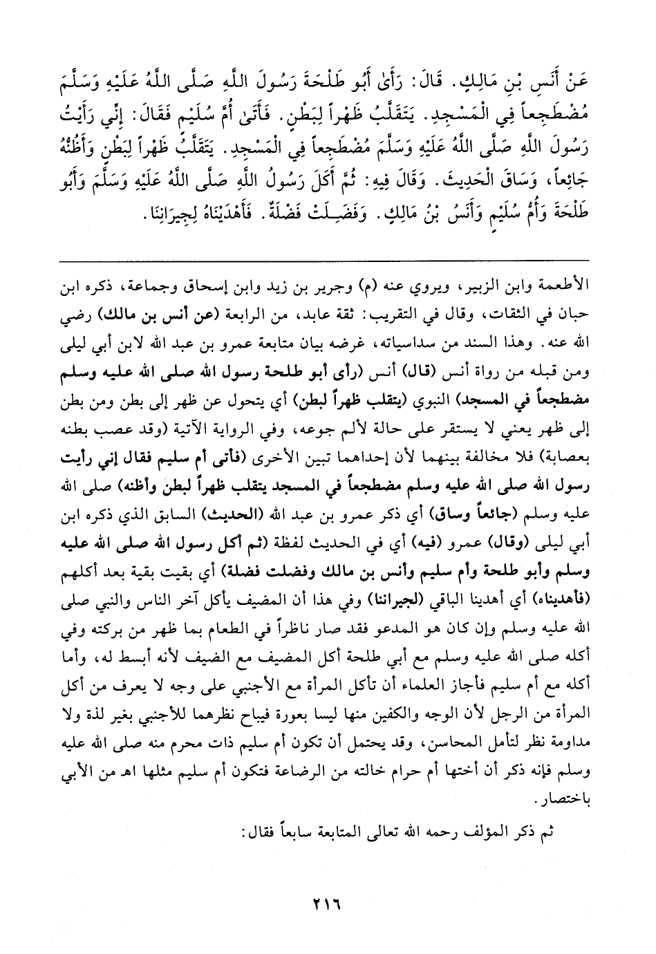 عَنْ أَنَسِ بْنِ مَالِكٍ. قَال: رَأَى أَبُو طَلْحَةَ رَسُولَ اللهِ صَلَّى اللهُ عَلَيهِ وَسَلَّمَ مُضْطَجِعًا فِي الْمَسْجِدِ. يَتَقَلَّبُ ظَهْرًا لِبَطْنٍ. فَأَتَى أُمِّ سُلَيمٍ فَقَال: إِنِّي رَأَيتُ رَسُولَ اللهِ صَلَّى اللهُ عَلَيهِ وَسَلَّمَ مُضْطَجِعًا في الْمَسْجِدِ. يَتَقَلَّبُ ظَهْرًا لِبَطْنِ وَأَظُنُّهُ جَائِعًا، وَسَاقَ الْحَدِيثَ. وَقَال فِيهِ: ثُمَّ أَكَلَ رَسُولُ اللهِ صَلَّى اللهُ عَلَيهِ وَسَلَّمَ وَأَبُو طَلْحَةَ وَأُمُّ سُلَيمٍ وَأَنَسُ بْنُ مَالِكٍ. وَفَضَلَتْ فَضْلَةٌ. فَأَهْدَينَاهُ لِجِيرَانِنَا