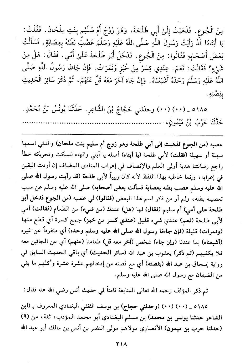 مِنَ الْجُوعِ. فَذَهَبْتُ إلى أَبِي طَلْحَةَ، وَهُوَ زَوْجُ أُمِّ سُلَيم بِنْتِ مِلْحَانَ. فَقُلْتُ: يَا أَبَتَاهُ! قَدْ رَأَيتُ رَسُولَ الله صلى الله عَلَيهِ وَسلمَ عَضَبَ بَطْنَهُ بِعِصَابَةٍ. فَسَأَلْتُ بَعْضَ أَصْحَابِهِ فَقَالُوا: مِنَ الْجُوعِ. فَدَخَلَ أَبُو طَلْحَةَ عَلَى أُمي. فَقَال: هَلْ مِنْ شَيءٍ؟ فَقَالتْ: نَعَمْ. عِنْدِي كِسَرٌ مِنْ خُبْزٍ وَتَمَرَاتٌ. فَإِنْ جَاءَنَا رَسُولُ الله صلى اللهُ عَلَيهِ وسلَّمَ وَحْدَهُ أشْبَعْنَاهُ. وَإِنْ جَاءَ آخَرُ مَعَهُ قَل عَنْهُمْ، ثُمَّ ذَكَرَ سَائِرَ الْحَدِيثِ بِقِصَّتِهِ.
