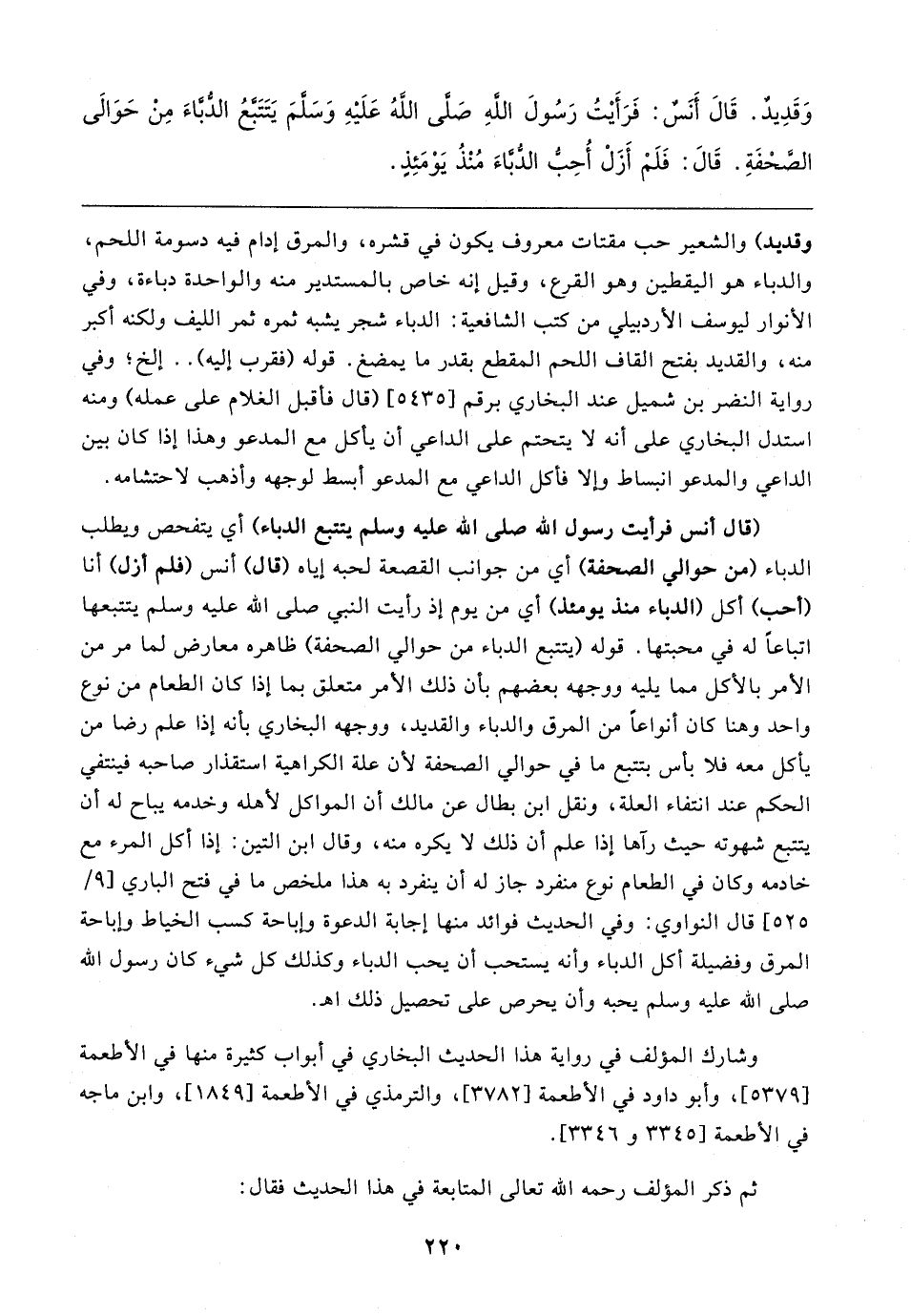 وَقَدِيدٌ. قَال أَنَسٌ: فَرَأَيتُ رَسُولَ الله صلى اللهُ عَلَيهِ وَسلمَ يَتَتَبَّعُ الدُّبَّاءَ مِنْ حَوَالي الصَّحْفَةِ. قَال: فَلَمْ أَزَلْ أُحِبُّ الدُّبَّاءَ مُنْذُ يَوْمَئِذٍ