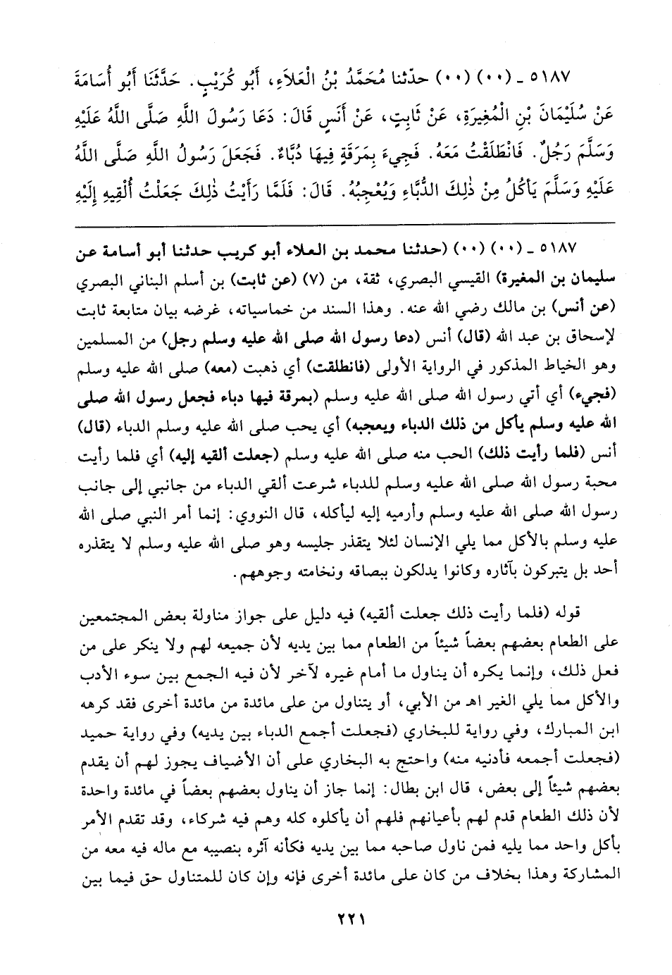 ٥١٨٧ - (٠٠) (٠٠) حدثنا محمدُ بْنُ الْعَلاءِ، أبُو كُرَيبٍ. حَدَّثَنَا أَبُو أُسَامَةَ عَنْ سُلَيمَانَ بْنِ الْمُغِيرَةِ، عَنْ ثَابِتٍ، عَنْ أَنَسٍ قَال: دَعَا رَسُولَ الله صَلَّى اللهُ عَلَيهِ وسلَّمَ رَجُلٌ. فَانْطَلَقْتُ مَعَهُ. فَجِيءَ بِمَرَقَةِ فِيهَا دُبَّاءٌ. فَجَعَلَ رَسُولُ الله صَلى اللهُ عَلَيهِ وسلَّمَ يَأكُلُ مِنْ ذلِكَ الدُّبَّاءِ وَيُعْجِبُهُ. قَال: فَلَمَّا رَأيتُ ذلِكَ جَعَلْتُ ألْقِيهِ إِلَيهِ