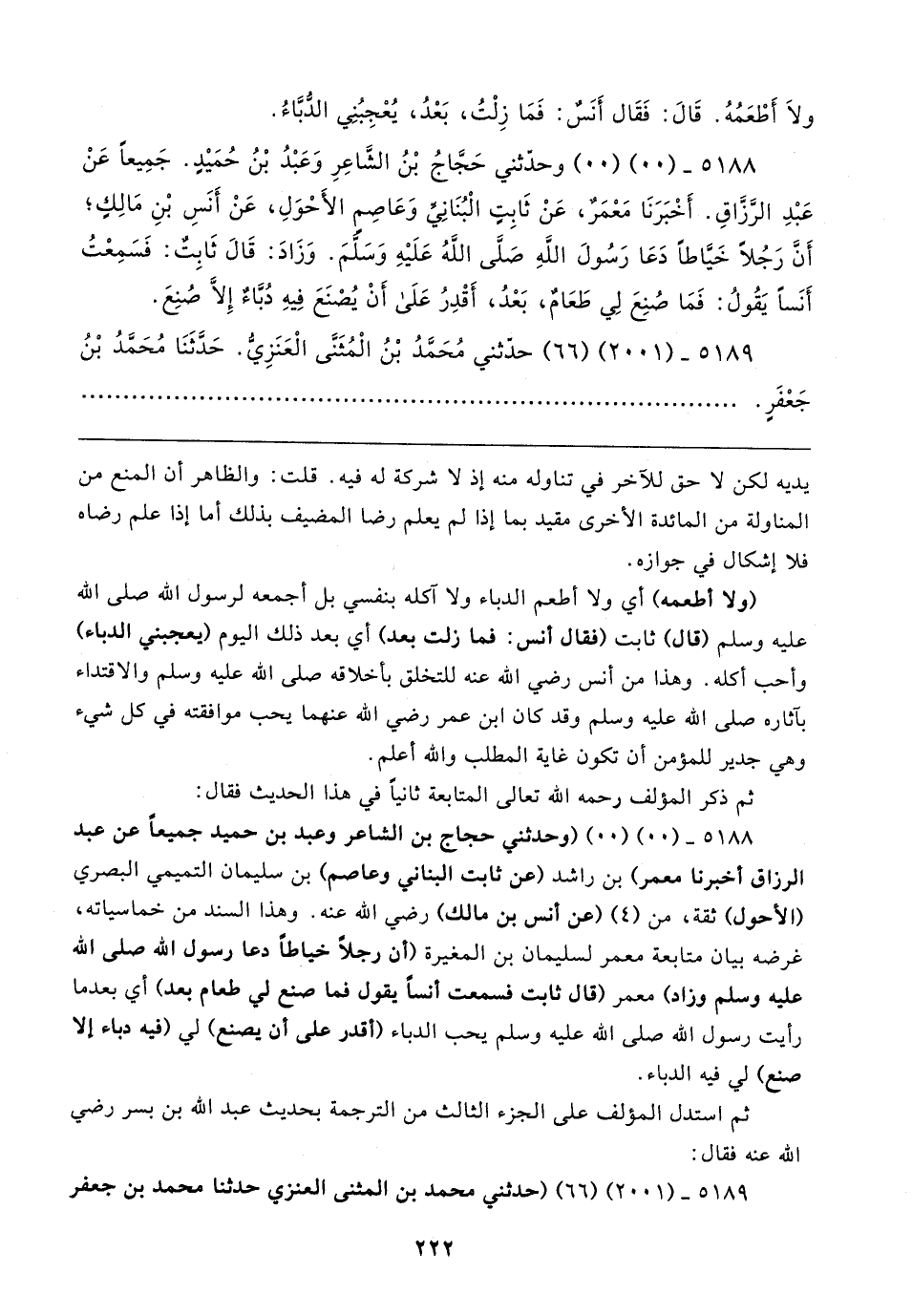 ٥١٨٨ - (٠٠) (٠٠) (وحدثني حجاج بن الشاعر وعبد بن حميد جميعًا عن عبد الرزاق أخبرنا معمر) بن راشد (عن ثابت البناني وعاصم) بن سليمان التميمي البصري (الأحول) ثقة، من (٤) (عن أنس بن مالك) رضي الله عنه. وهذا السند من خماسياته، غرضه بيان متابعة معمر لسليمان بن المغيرة (أن رجلًا خياطًا دعا رسول الله صلى الله عليه وسلم وزاد) معمر (قال ثابت فسمعت أنسًا يقول فما صنع لي طعام بعد) أي بعد ما رأيت رسول الله صلى الله عليه وسلم يحب الدباء (أقدر على أن يصنع) لي (فيه دباء إلا صنع) لي فيه الدباء.