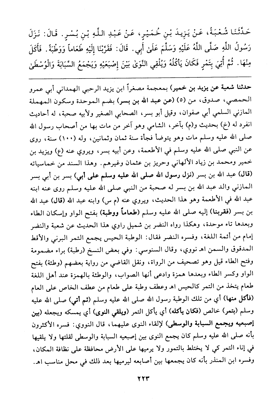 حَدَّثَنَا شُعْبَةُ، عَنْ يَزِيدَ بْنِ خُمَيرٍ، عَنْ عَبْدِ الله بْنِ بُسْرٍ. قَال: نَزَلَ رَسُولُ اللهِ صلى الله عَلَيهِ وَسلمَ عَلَى أَبِي. قَال: فَقَرَّبْنَا إِلَيهِ طَعَامًا وَوَطْبَةً. فَأَكَلَ مِنْهَا. ثُمّ أُتِيَ بِتَمْرِ فَكَانَ يَأكُلُهُ وَيُلْقِي النوَى بَينَ إِصْبَعَيهِ وَيجْمَعُ السَّبَابَةَ وَالْوُسْطَى