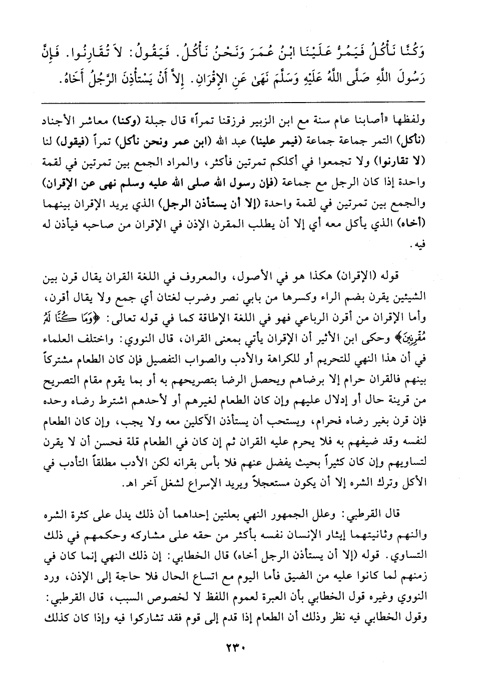 قوله (الإقران) هكذا هو في الأصول، والمعروف في اللغة القرآن يقال قرن بين الشيئين يقرن بضم الراء وكسرها من بابي نصر وضرب لغتان أي جمع ولا يقال أقرن، وأما الإقران من أقرن الرباعي فهو في اللغة الإطاقة كما في قوله تعالى: {وَمَا كُنَّا لَهُ مُقْرِنِينَ} وحكى ابن الأثير أن الإقران يأتي بمعنى القرآن، قال النووي: واختلف العلماء في أن هذا النهي للتحريم أو للكراهة والأدب والصواب التفصيل فإن كان الطعام مشتركًا بينهم فالقران حرام إلا برضاهم ويحصل الرضا بتصريحهم به أو بما يقوم مقام التصريح من قرينة حال أو إدلال عليهم وإن كان الطعام لغيرهم أو لأحدهم اشترط رضاه وحده فإن قرن بغير رضاه فحرام، ويستحب أن يستأذن الآكلين معه ولا يجب، وإن كان الطعام لنفسه وقد ضيفهم به فلا يحرم عليه القرآن ثم إن كان في الطعام قلة فحسن أن لا يقرن لتساويهم وإن كان كثيرًا بحيث يفضل عنهم فلا بأس بقرانه لكن الأدب مطلقًا التأدب في الأكل وترك الشره إلا أن يكون مستعجلًا ويريد الإسراع لشغل آخر اهـ.