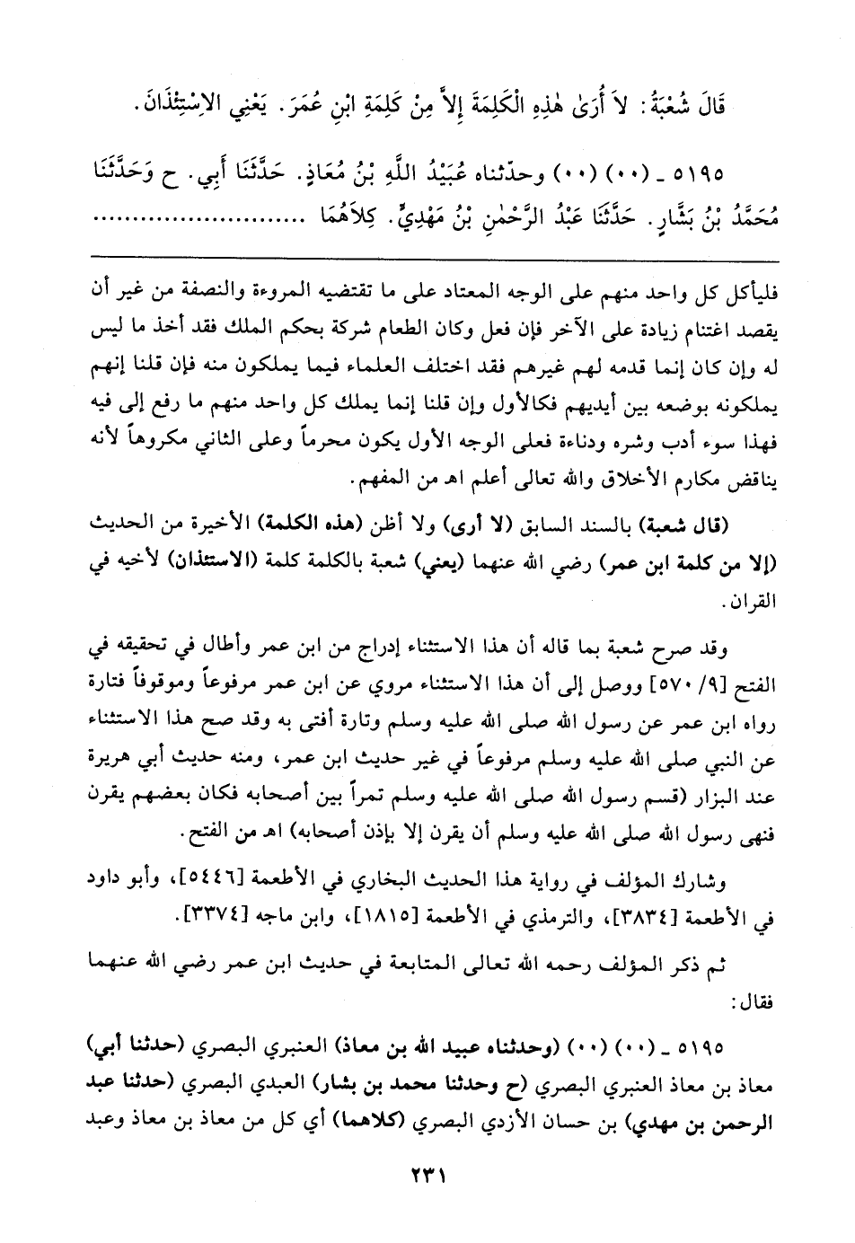 قَال شُعْبَةُ: لَا أُرَى هذِهِ الْكَلِمَةَ إلا مِنْ كَلِمَةِ ابْنِ عُمَرَ. يَعْنِي الاسْتِئذَانَ.