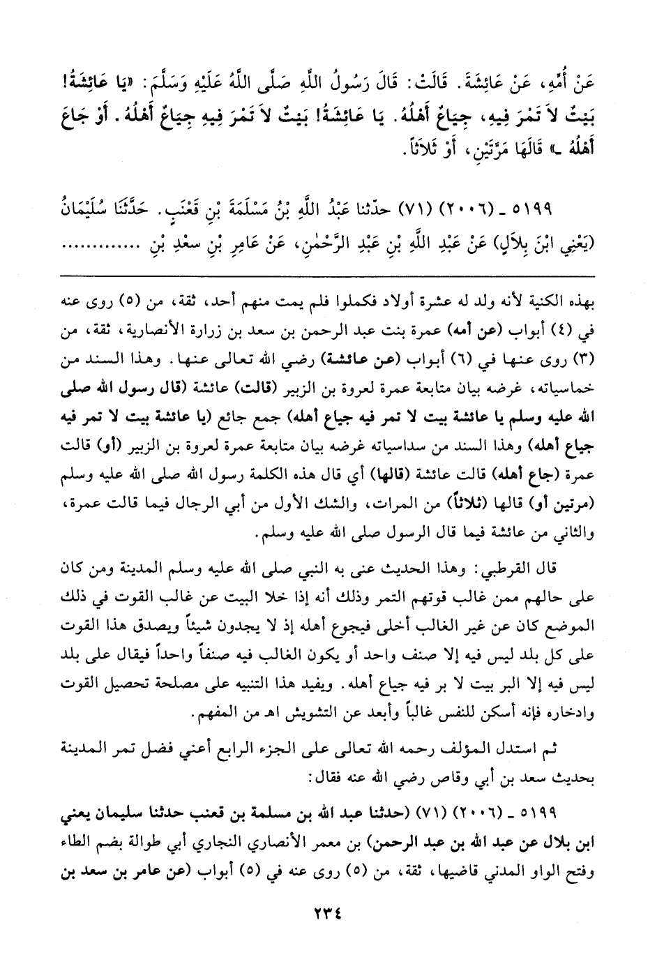بهذه الكنية لأنه ولد له عشرة أولاد فكملوا فلم يمت منهم أحد، ثقة، من (٥) روى عنه في (٤) أبواب (عن أمه) عمرة بنت عبد الرحمن بن سعد بن زرارة الأنصارية، ثقة، من (٣) روى عنها في (٦) أبواب (عن عائشة) رضي الله تعالى عنها. وهذا السند من خماسياته، غرضه بيان متابعة عمرة لعروة بن الزبير (قالت) عائشة (قال رسول الله صلى الله عليه وسلم يا عائشة بيت لا تمر فيه جياع أهله) جمع جائع (يا عائشة بيت لا تمر فيه جياع أهله) وهذا السند من سداسياته غرضه بيان متابعة عمرة لعروة بن الزبير (أو) قالت عمرة (جاع أهله) قالت عائشة (قالها) أي قال هذه الكلمة رسول الله صلى الله عليه وسلم (مرتين أو) قالها (ثلاثًا) من المرات، والشك الأول من أبي الرجال فيما قالت عمرة، والثاني من عائشة فيما قال الرسول صلى الله عليه وسلم.