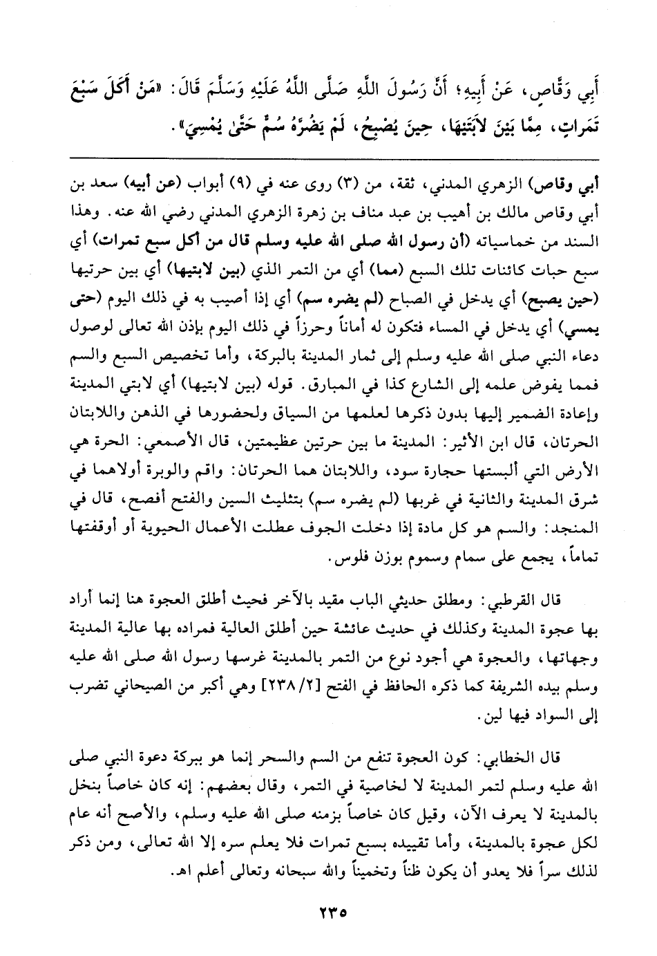 أبي وقاص) الزهريّ المدني، ثقة، من (٣) روى عنه في (٩) أبواب (عن أبيه) سعد بن أبي وقاص مالك بن أهيب بن عبد مناف بن زهرة الزهريّ المدني رضي الله عنه. وهذا السند من خماسياته (أن رسول الله صلى الله عليه وسلم قال من أكل سبع تمرات) أي سبع حبات كائنات تلك السبع (مما) أي من التمر الذي (بين لابتيها) أي بين حرتيها (حين يصبح) أي يدخل في الصباح (لم يضره سم) أي إذا أصيب به في ذلك اليوم (حتى يمسي) أي يدخل في المساء فتكون له أمانًا وحرزًا في ذلك اليوم بإذن الله تعالى لوصول دعاء النبي صلى الله عليه وسلم إلى ثمار المدينة بالبركة، وأما تخصيص السبع والسم فمما يفوض علمه إلى الشارع كذا في المبارق. قوله (بين لابتيها) أي لابتي المدينة وإعادة الضمير إليها بدون ذكرها لعلمها من السياق ولحضورها في الذهن واللابتان الحرتان، قال ابن الأثير: المسندينة ما بين حرتين عظيمتين، قال الأصمعي: الحرة هي الأرض التي ألبستها حجارة سود، واللابتان هما الحرتان: واقم والوبرة أولاهما في شرق المدينة والثانية في غربها (لم يضره سم) بتثليث السين والفتح أفصح، قال في المنجد: والسم هو كل مادة إذا دخلت الجوف عطلت الأعمال الحيوية أو أوقفتها تمامًا، يجمع على سمام وسموم بوزن فلوس.
