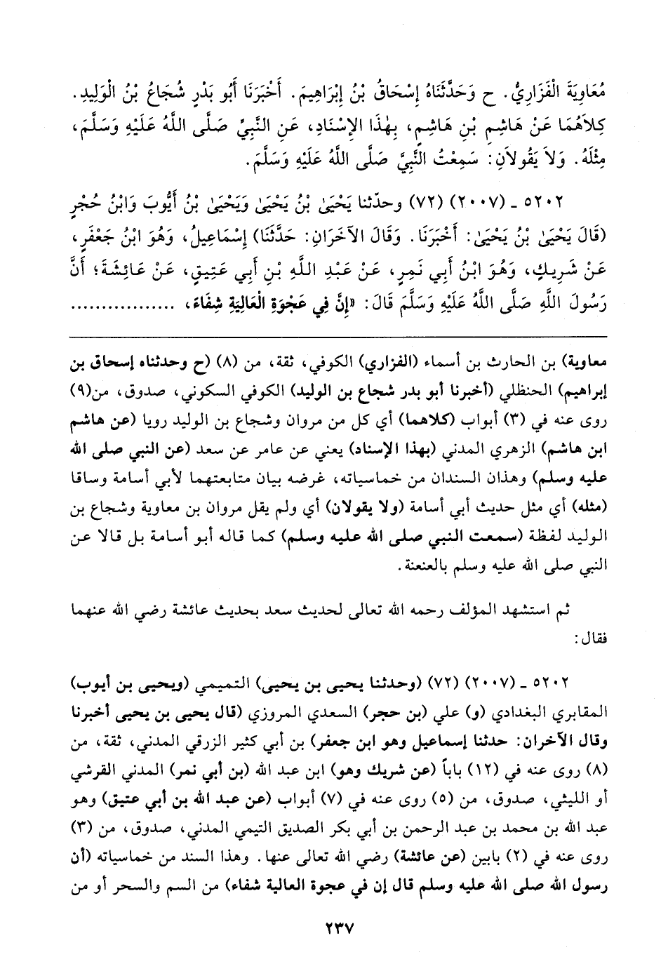 ٥٢٠٢ - (٢٠٠٧) (٧٢) وحدثنا يحيى بن يحيى) التميمي (ويحيى بن أيوب) المقابري البغدادي (و) علي (بن حجر) السعدي المروزي (قال يحيى بن يحيى أخبرنا وقال الآخران: حدثنا إسماعيل وهو ابن جعفر) بن أبي كثير الزرقي المدني، ثقة، من (٨) روى عنه في (١٢) بابا (عن شريك وهو) ابن عبد الله (بن أبي نمر) المدني القرشي أو الليثي، صدوق، من (٥) روى عنه في (٧) أبواب (عن عبد الله بن أبي عتيق) وهو عبد الله بن محمَّد بن عبد الرحمن بن أبي بكر الصديق التيمي المدني، صدوق، من (٣) روى عنه في (٢) بابين (عن عائشة) رضي الله تعالى عنها. وهذا السند من خماسياته (أن رسول الله صلى الله عليه وسلم قال إن في عجوة العالية شفاء) من السم والسحر أو من
