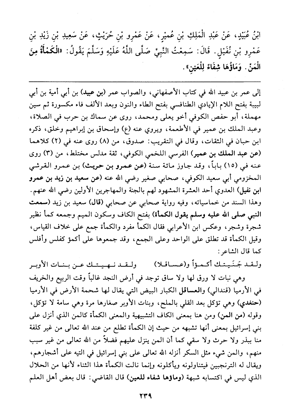 ابْنُ عُبَيدٍ، عَنْ عَبْدِ الْمَلِكِ بْنِ عُميرٍ، عَنْ عَمْرِو بْنِ حُرَيثٍ، عَنْ سَعِيدِ بْنِ زَيدِ بْنِ عَمْرِو بْنِ نُفَيلٍ. قَال: سَمِعْتُ النبي صلى الله عَلَيهِ وَسلمَ يَقُولُ: "الْكَمْأَةُ مِنَ الْمَنِّ. وَمَاؤُهَا شِفَاءٌ لِلْعَينِ"