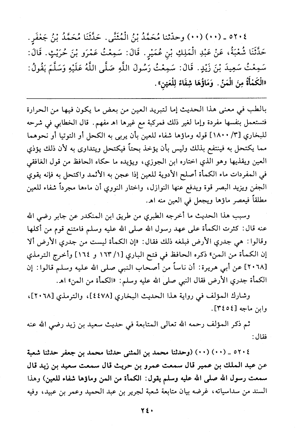 ٥٢٠٤ - (٠٠) (٠٠) (وحدثنا محمَّد بن المثنى حدثنا محمَّد بن جعفر حدثنا شعبة عن عبد الملك بن عمير قال سمعت عمرو بن حريث قال سمعت سعيد بن زيد قال سمعت رسول الله صلى الله عليه وسلم يقول: الكمأة من المن وماؤها شفاء للعين) وهذا السند من سداسياته، غرضه بيان متابعة شعبة لجرير بن عبد الحميد وعمر بن عبيد، وفيه