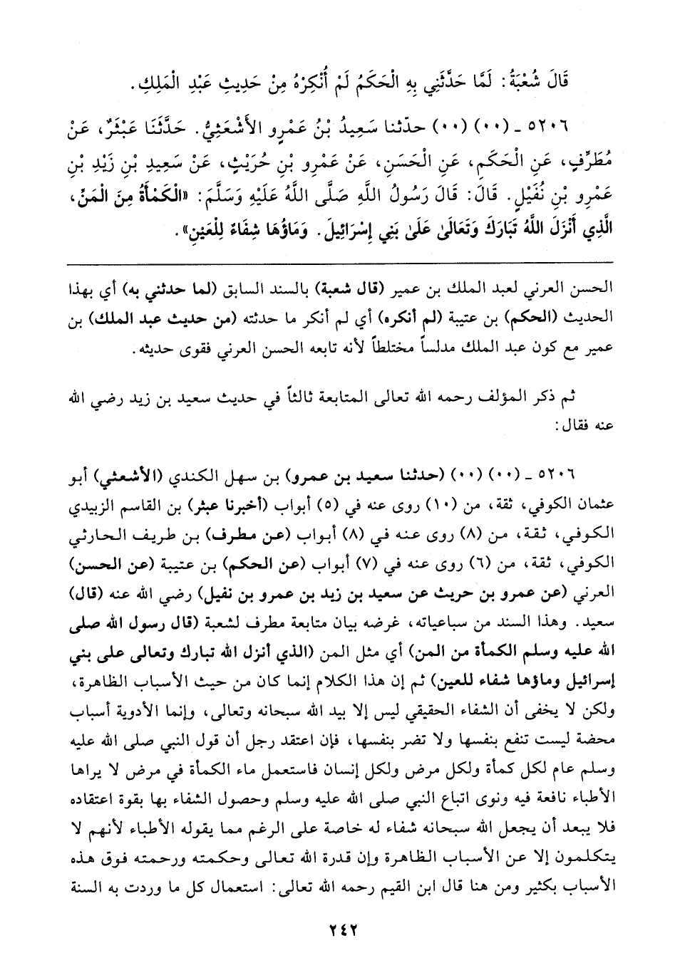 ٥٢٠٦ - (٠٠) (٠٠) (حدثنا سعيد بن عمرو) بن سهل الكندي (الأشعثي) أبو عثمان الكوفي، ثقة، من (١٠) روى عنه في (٥) أبواب (أخبرنا عبثر) بن القاسم الزبيدي الكوفي، ثقة، من (٨) روى عنه في (٨) أبواب (عن مطرف) بن طريف الحارثي الكوفي، ثقة، من (٦) روى عنه في (٧) أبواب (عن الحكم) بن عتيبة (عن الحسن) العرني (عن عمرو بن حريث عن سعيد بن زيد بن عمرو بن نفيل) رضي الله عنه (قال) سعيد. وهذا السند من سباعياته، غرضه بيان متابعة مطرف لشعبة (قال رسول الله صلى الله عليه وسلم الكمأة من المن) أي مثل السنن (الذي أنزل الله تبارك وتعالى علي بني إسرائيل وماؤها شفاء للعين) ثم إن هذا الكلام إنما كان من حيث الأسباب الظاهرة، ولكن لا يخفى أن الشفاء الحقيقي ليس إلا بيد الله سبحانه وتعالى، وإنما الأدوية أسباب محضة ليست تنفع بنفسها ولا تضر بنفسها، فإن اعتقد رجل أن قول النبي صلى الله عليه وسلم عام لكل كمأة ولكل مرض ولكل إنسان فاستعمل ماء الكمأة في مرض لا يراها الأطباء نافعة فيه ونوى اتباع النبي صلى الله عليه وسلم وحصول الشفاء بها بقوة اعتقاده فلا يبعد أن يجعل الله سبحانه شفاء له خاصة على الرغم مما يقوله الأطباء لأنهم لا يتكلمون إلا عن الأسباب الظاهرة وإن قدرة الله تعالى وحكمته ورحمته فوق هذه الأسباب بكثير ومن هنا قال ابن القيم رحمه الله تعالى: استعمال كل ما وردت به السنة