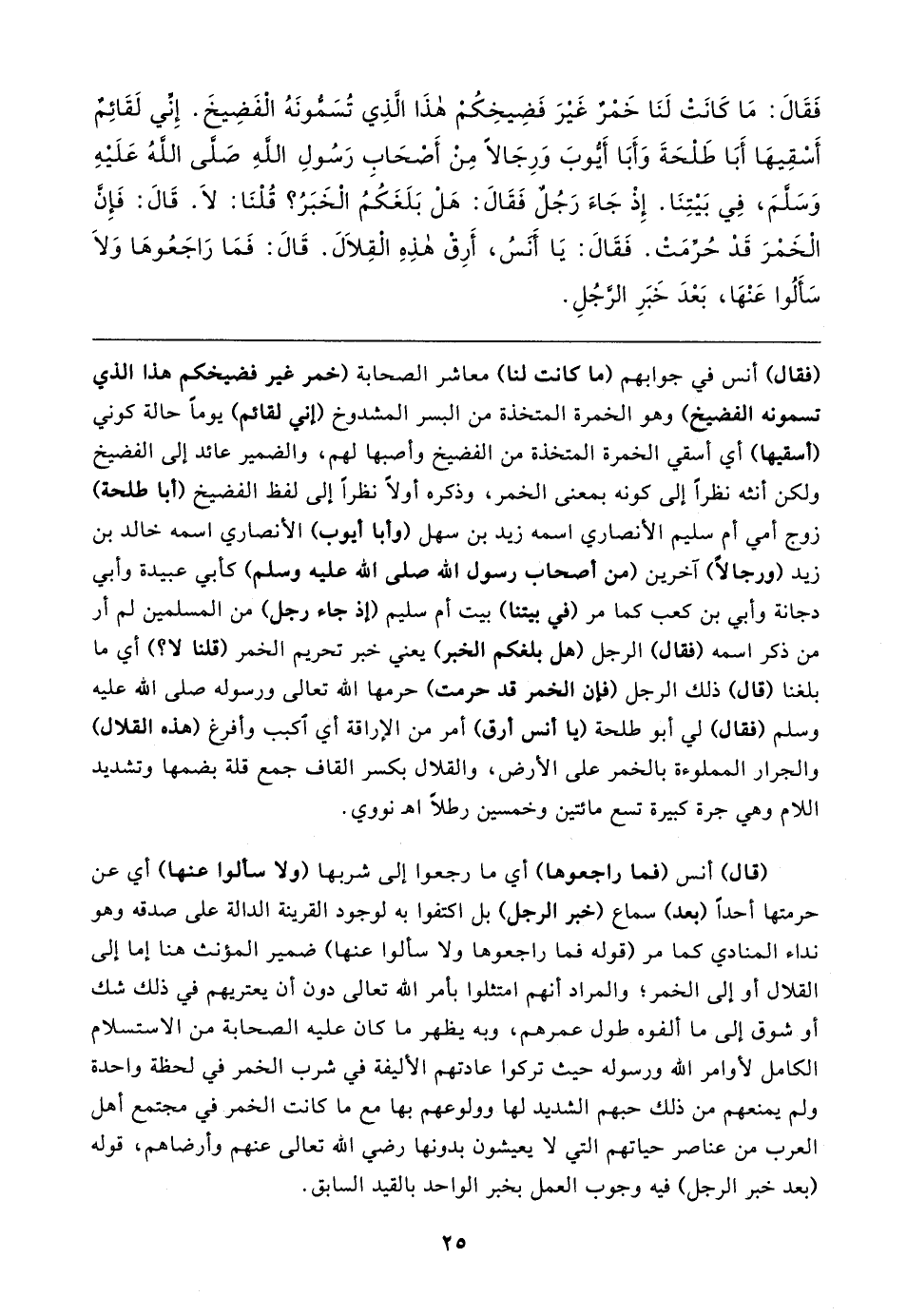 فَقَال: مَا كَانَتْ لَنَا خَمْرٌ غَيرَ فَضيخِكُمْ هذَا الّذِي تُسَمُّونَهُ الفَضِيخَ. إِنِّي لَقَائِمْ أَسْقِيهَا أَبَا طَلحَةَ وَأَبَا أَيوبَ وَرِجَالًا مِنْ أَصْحَابِ رَسُولِ اللهِ صلى الله عَلَيهِ وَسلمَ، في بَيتِنَا. إِذْ جَاءَ رَجُلٌ فَقَال: هَل بَلَغَكُمُ الخَبَرُ؟ قُلنَا: لا. قَال: فَإِن الخَمْرَ قَدْ حُرِّمَتْ. فَقَال: يَا أَنَس، أَرِقْ هذِهِ القِلال. قَال: فَمَا رَاجَعُوهَا وَلا سَأَلُوا عَنْهَا، بَعْدَ خَبَرِ الرّجُلِ