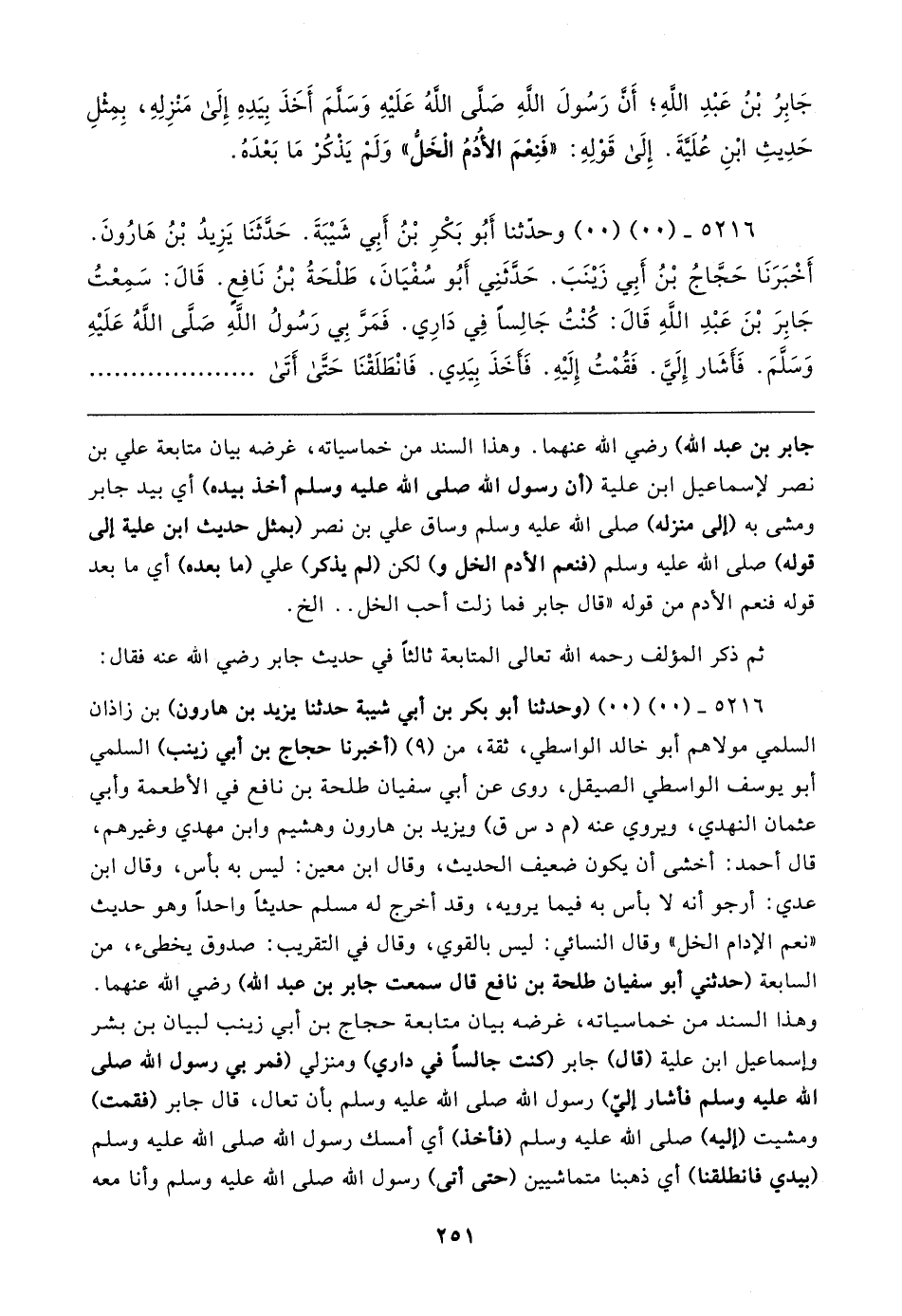 ٥٢١٦ - (٠٠) (٠٠) وحدّثنا أبُو بَكْرِ بْنُ أبي شَيبَةَ. حَدَّثَنَا يَزِيدُ بْنُ هَارُونَ. أَخْبَرَنَا حَجَّاجُ بْنُ أَبِي زينَبَ. حَدَّثَنِي أَبُو سُفْيَانَ، طَلْحَةُ بْنُ نَافِع. قَال: سَمِعْتُ جَابِرَ بْنَ عَبْدِ اللهِ قَال: كُنْتُ جَالِسًا في دَارِي. فَمَرَّ بِي رَسُولُ اللهِ صَلَّى الله عَلَيهِ وسلَمَ. فَأَشَار إِلَيَ. فَقُمْتُ إِلَيهِ. فَأخَذَ بِيَدِي. فَانْطَلَقْنَا حَتَّى أَتَى