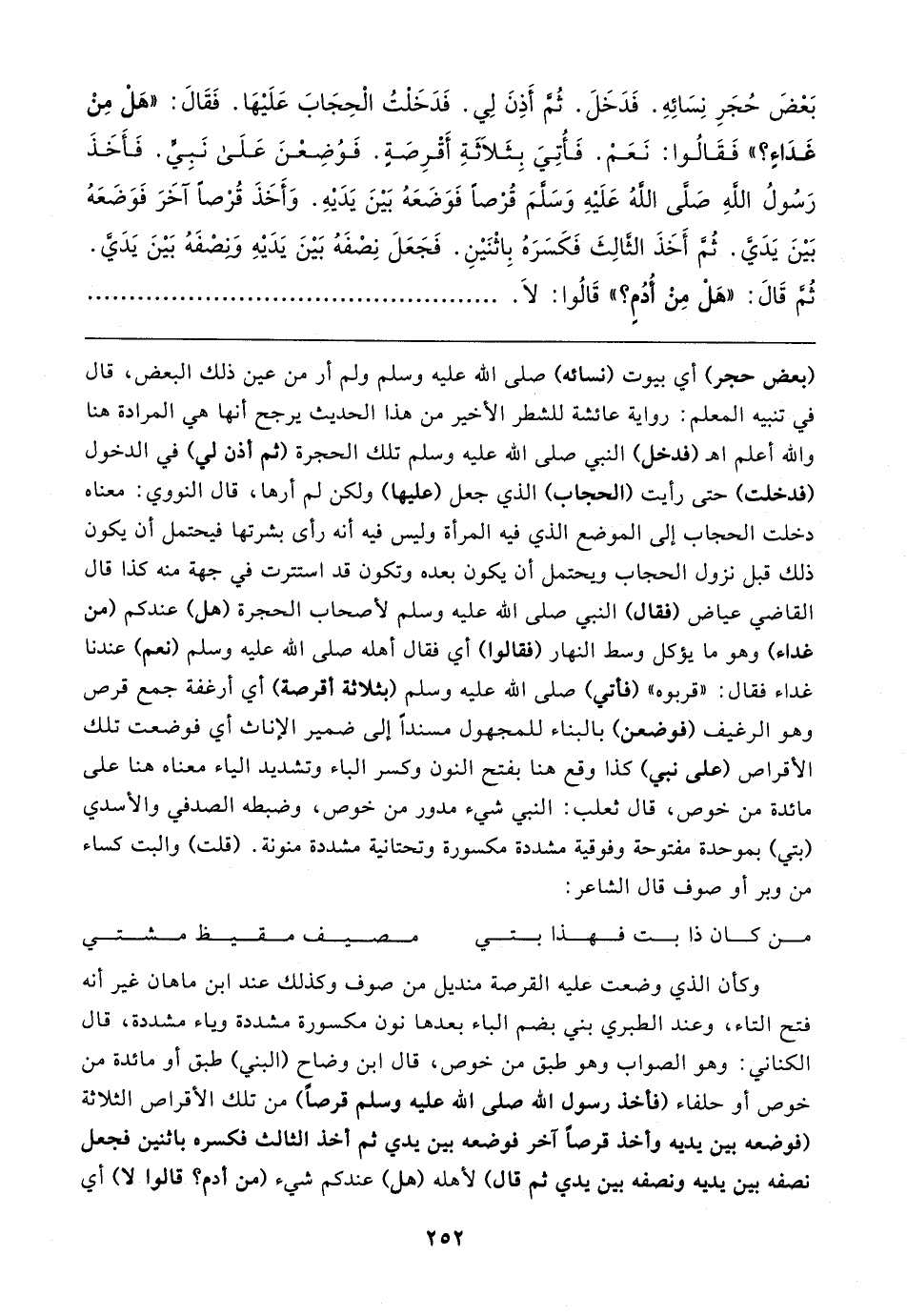 بَعْضَ حُجَرِ نِسَائِهِ. فَدَخَلَ. ثُمَّ أَذِنَ لِي. فَدَخَلْتُ الْحِجَابَ عَلَيهَا. فَقَال: "هَلْ مِنْ غَدَاءٍ؟ " فَقَالُوا: نَعَمْ. فَأُتِيَ بِثَلاثَةِ أَقْرِصَةٍ. فَوُضِعْنَ عَلَى نَبِي. فَأَخَذَ رَسُولُ الله صَلى الله عَلَيهِ وَسلمَ قُرْصًا فَوَضَعَهُ بَينَ يَدَيهِ. وَأَخَذَ قُرْصًا آخَرَ فَوَضَعَهُ بَينَ يَدَيَّ. ثُمّ أَخَذَ الثالِثَ فَكَسَرَهُ بِاثْنَينِ. فَجَعَلَ نِصْفَهُ بَينَ يَدَيهِ وَنِصْفَهُ بَينَ يَدَيَّ. ثُمَّ قَال: "هَلْ مِنْ أُدُمٍ؟ " قَالُوا: لَا