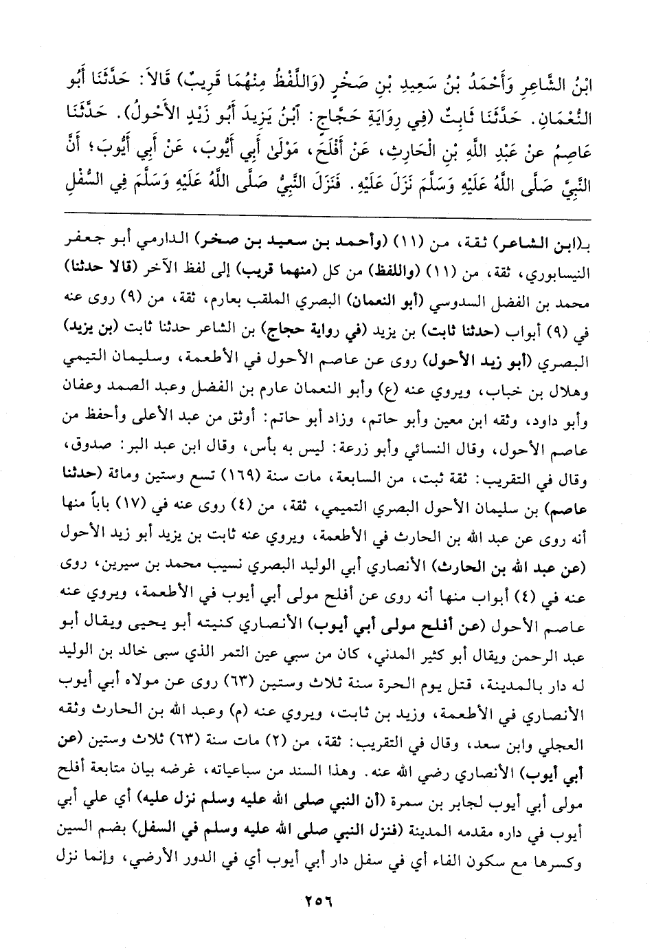 ابْنُ الشاعِرِ وَأَحْمَدُ بْنُ سَعِيدِ بْنِ صَخْرٍ (وَاللَّفْظُ مِنْهُمَا قَرِيبٌ) قَالا: حَدَّثَنَا أَبُو النُّعْمَانِ. حَدَّثَنَا ثَابِت (في رِوَايَةِ حَجَّاجٍ: ابْنُ يَزِيدَ أبُو زَيدٍ الأَحْولُ). حَدَّثَنَا عَاصِمُ عنْ عَبْدِ الله بْنِ الْحَارِثِ، عَنْ أَفْلَحَ، مَوْلَى أَبِي أيوبَ، عَنْ أبي أيوبَ؛ أَن النبيَّ صلى الله عَلَيهِ وَسلمَ نَزَلَ عَلَيهِ. فَنَزَلَ النبي صَلى الله عَلَيهِ وَسَلَّمَ في السفْلِ